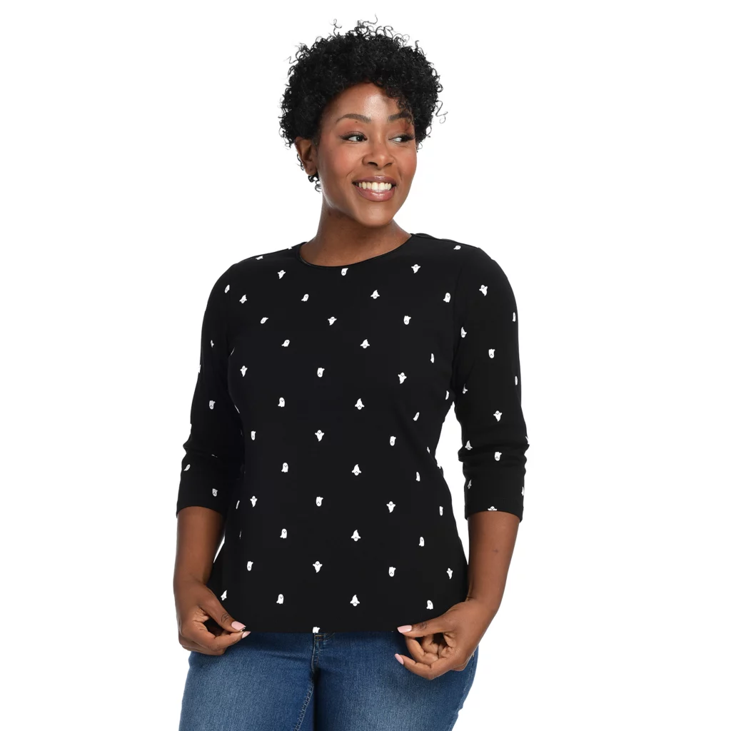 Polished ease to help you seize the day. Satin trim at the neckline adds a touch of elegant shine to this solid tee. It’s crafted using lightly ribbed cotton for a super-comfy fit. Great to dress up a pair of jeans or to top off a ponte skirt. Jewel neckline is the perfect shape for a necklace!