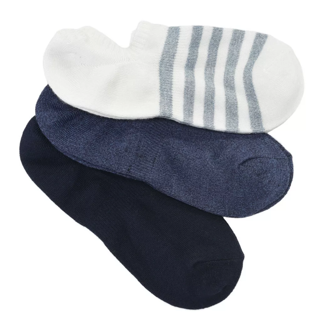 This 3-pack of ankle socks is soft and stretchy for a comfortable fit. Pair these with your favorite tennis shoe and enjoy support and comfort all day. Comes with one white with light blue stripes, one blue and one navy pair. Two size options available.