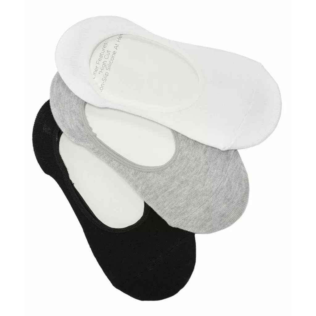 This 3-pack of no-show socks is soft and stretchy made for maximum comfort. Wear with your favorite sneaker or low rise shoe for a no-sock look. Comes with one white, one light heather grey and one black pair. Two size options available.
