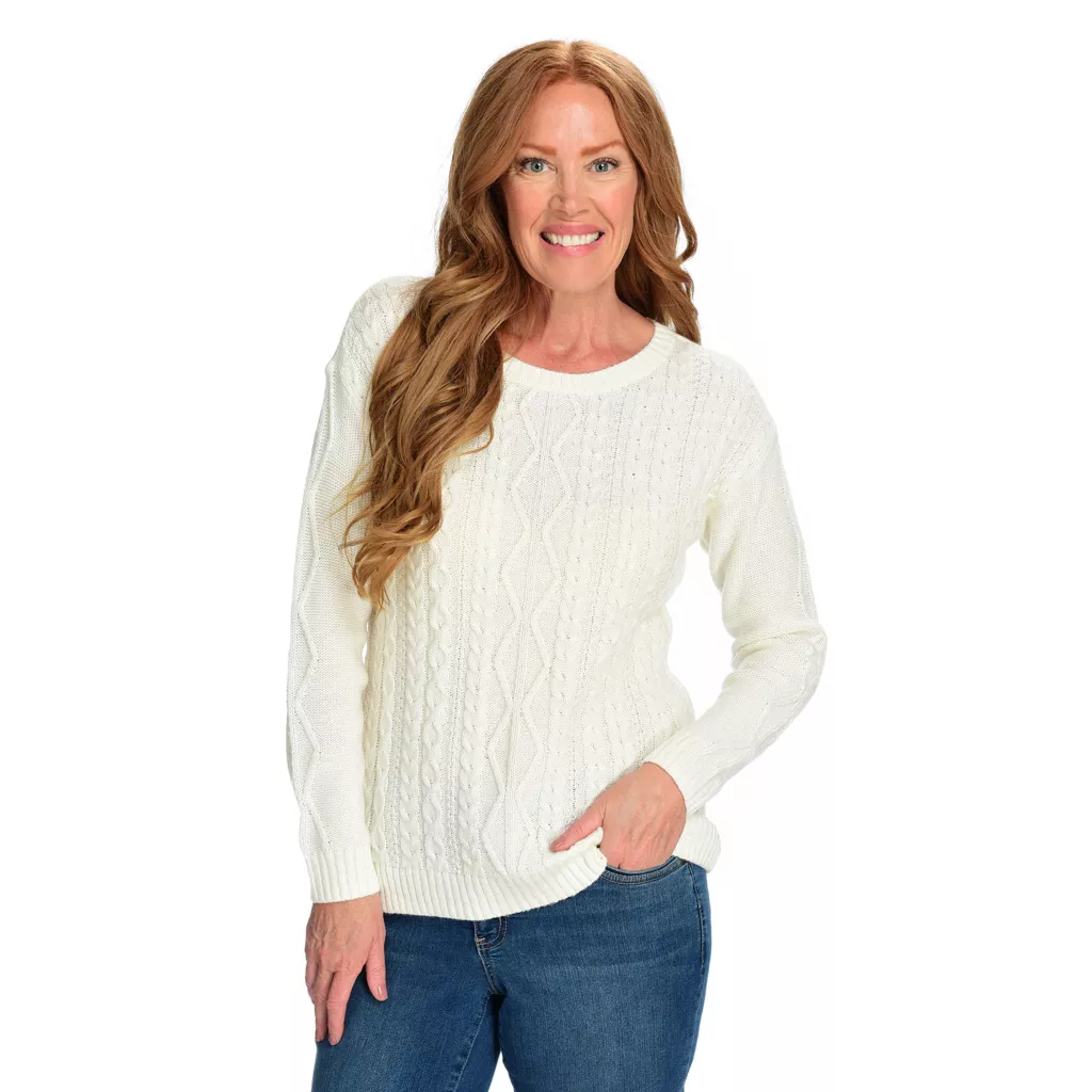 Snuggle into sweater season with this winter staple. Classic silhouette with cable knit detailing is easy to dress up or down, with jeans, skirts, and of course your favorite accessories!