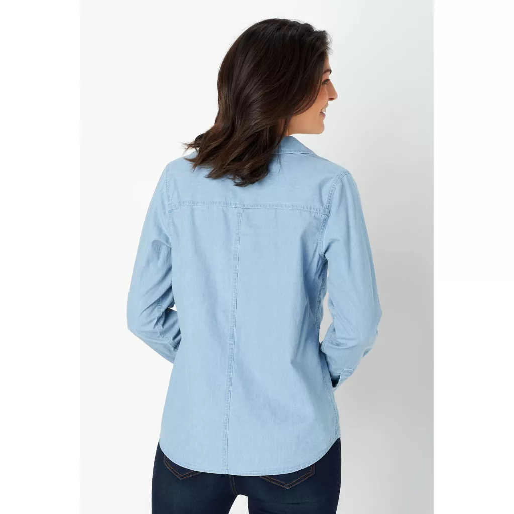 Breeze through summer in this soft cotton shirt. A warm-weather classic with button-flap chest pockets and buttoned sleeve cuffs, this lightweight chambray top is as versatile as your day. From a casual cabin weekend to lunch on a patio, it looks great paired with white denim or colorful capris.