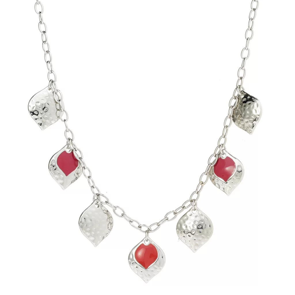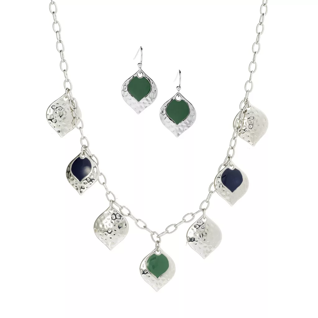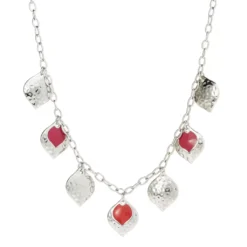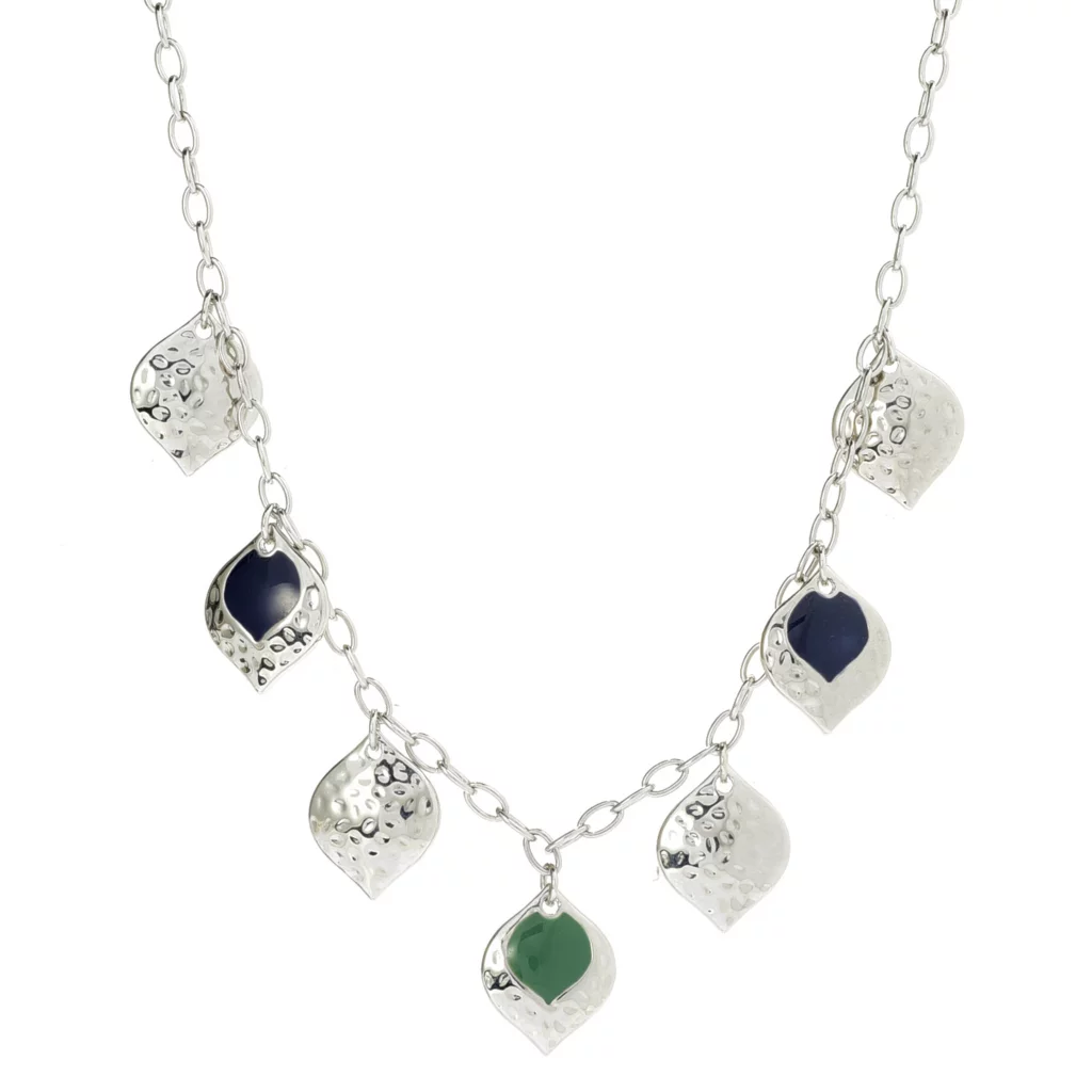 - Pretty blue and greens or earth reds paired with hammered metal drops are stationed along an oval chain.