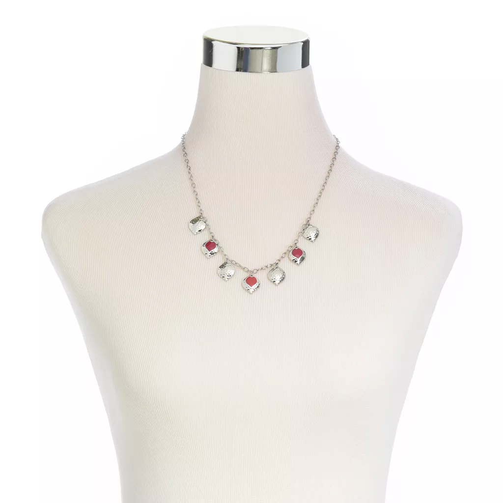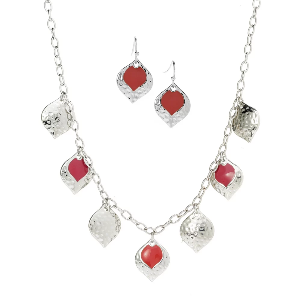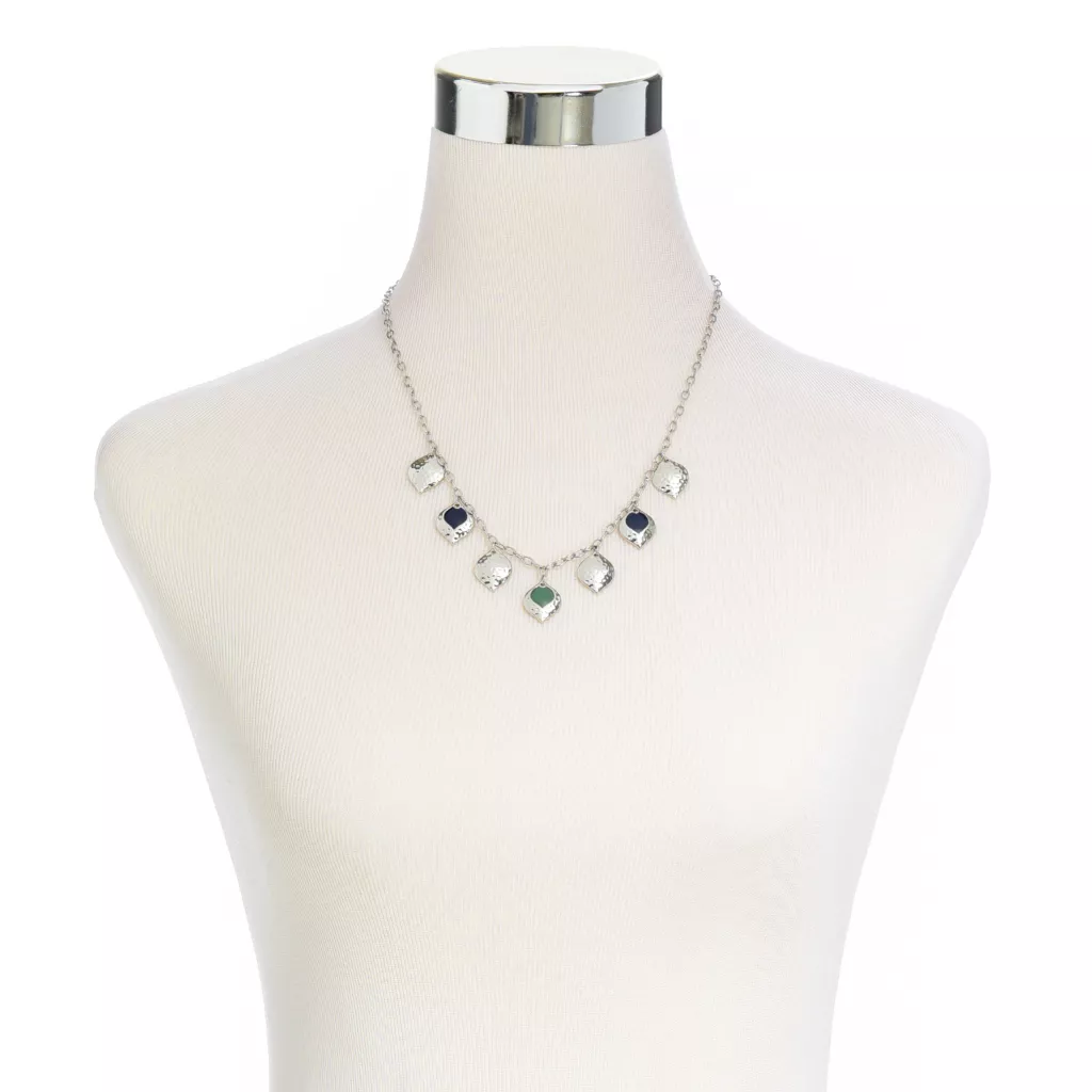 - Pretty blue and greens or earth reds paired with hammered metal drops are stationed along an oval chain.