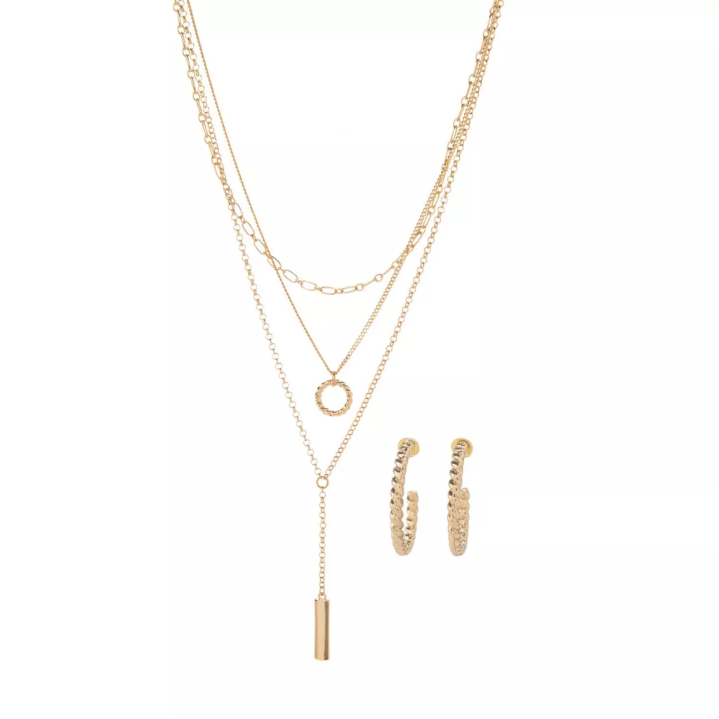 All-metal layered necklace with matching twisted hoop earrings. Each chain is connected with a lobster claw clasp so you can choose to wear 1, 2 or all 3!
