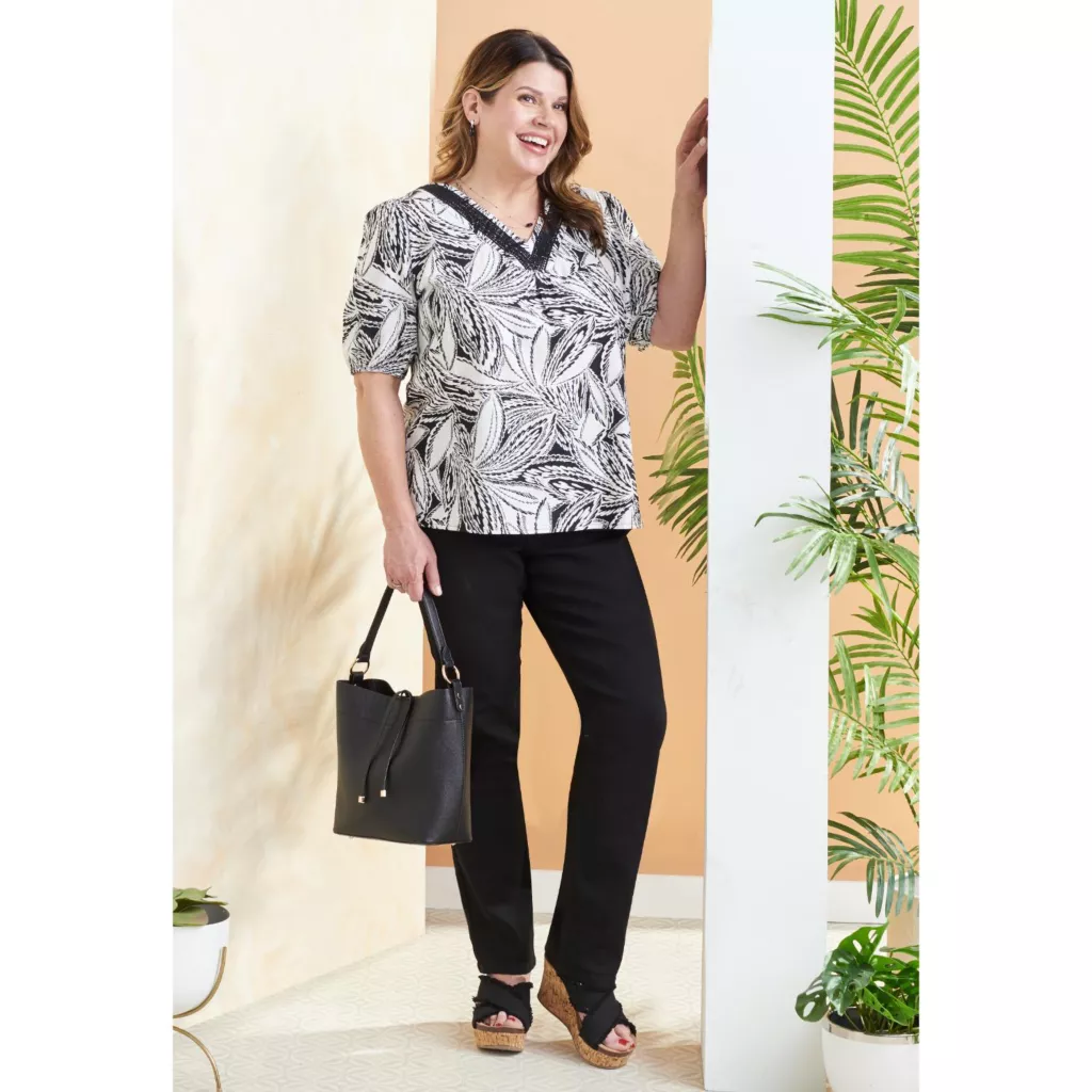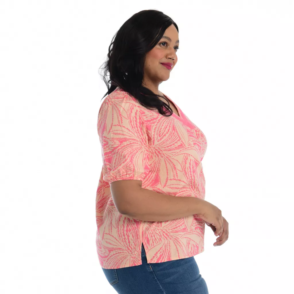 - Shirt Length: Missy(m): 26.5″; Woman(1x): 28.5″; Petite(m): 25.5″
