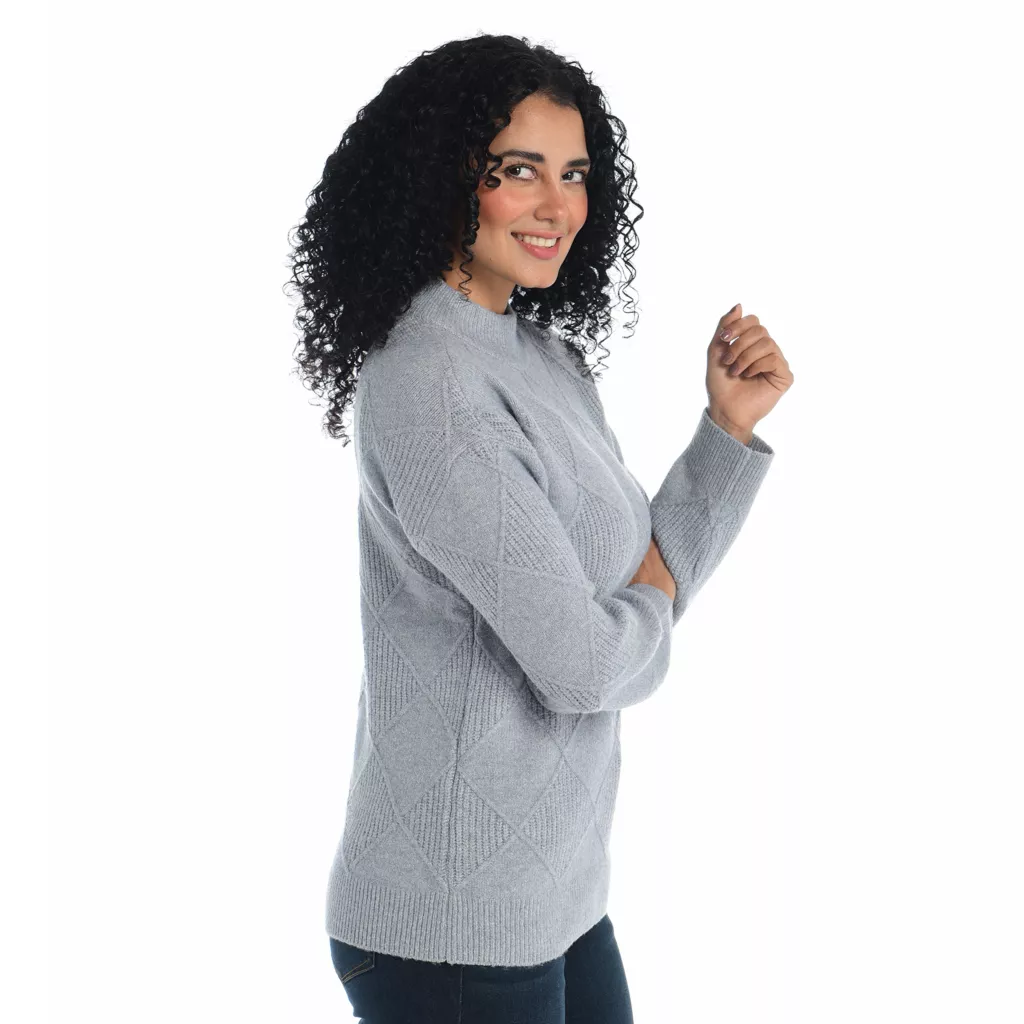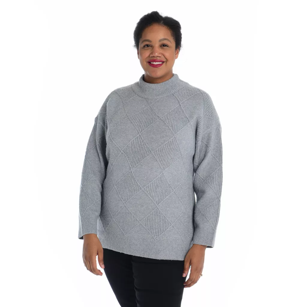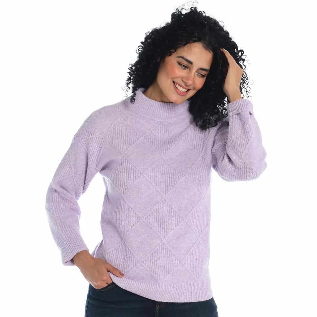 Elevate your look with our Diamond Mock Neck Sweater. The intricate diamond pattern adds a touch of sophistication, while the mock neck exudes contemporary style. Crafted for comfort and versatility, this sweater seamlessly transitions from day to night. Embrace elegance with cozy warmth, making it an essential addition to your wardrobe for any occasion.