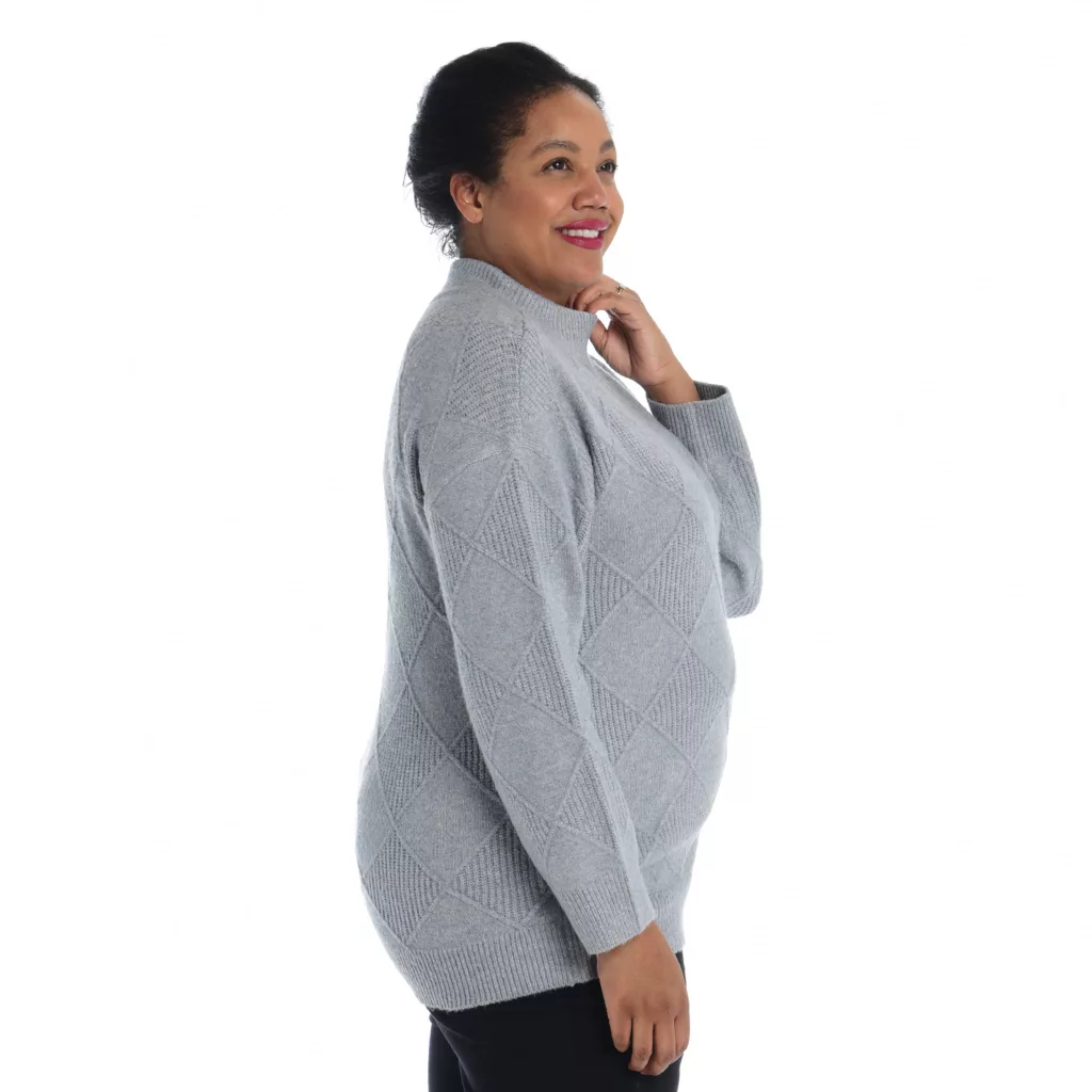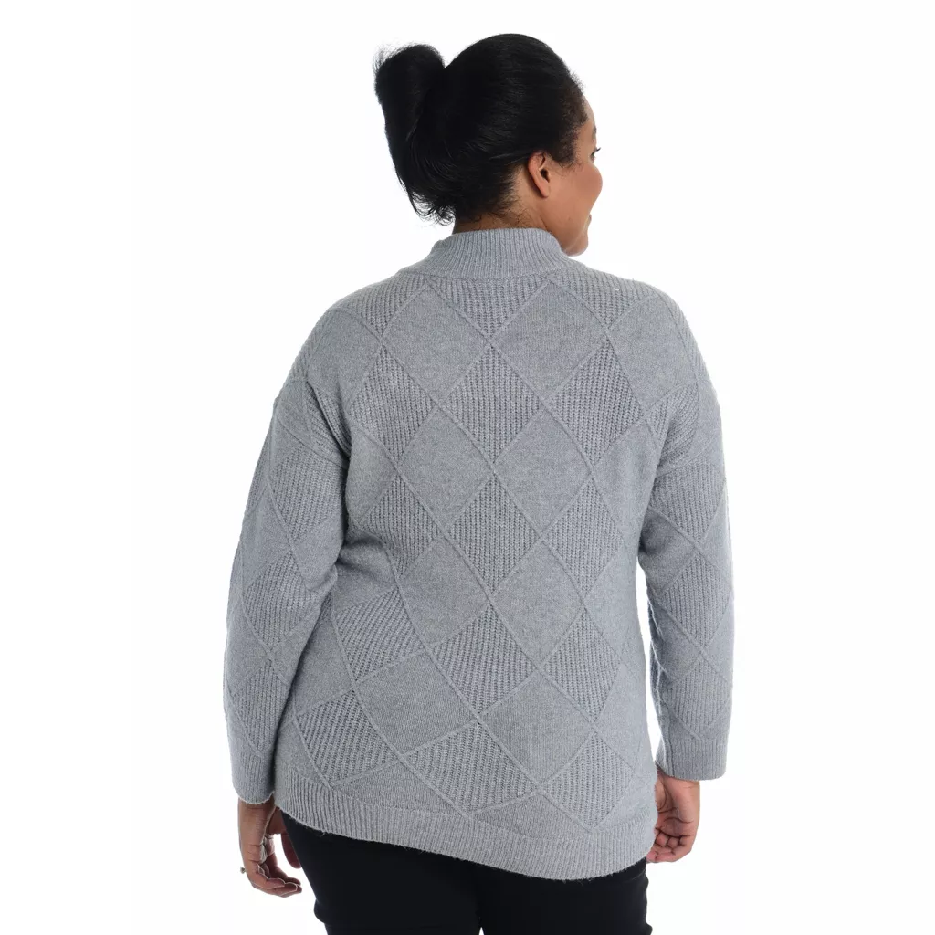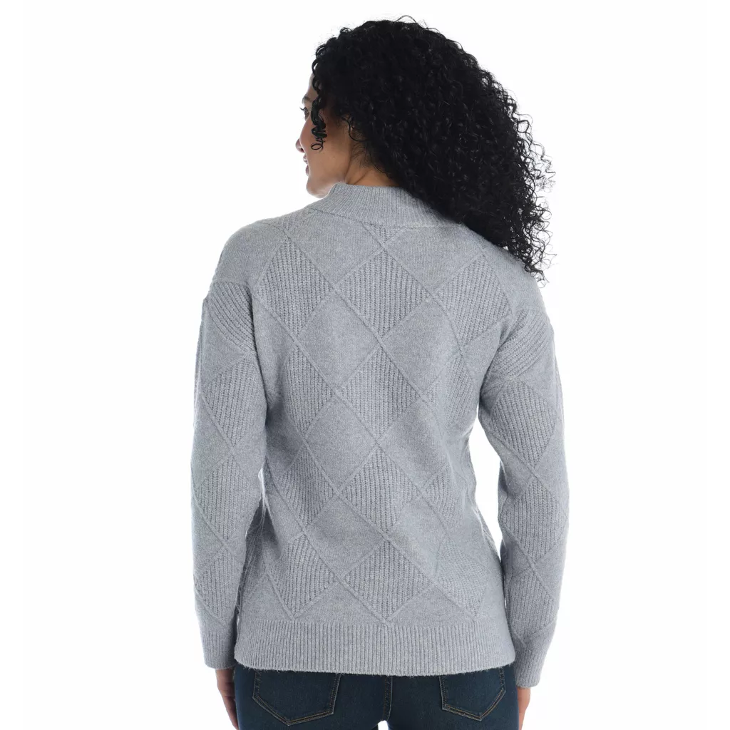 Elevate your look with our Diamond Mock Neck Sweater. The intricate diamond pattern adds a touch of sophistication, while the mock neck exudes contemporary style. Crafted for comfort and versatility, this sweater seamlessly transitions from day to night. Embrace elegance with cozy warmth, making it an essential addition to your wardrobe for any occasion.