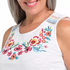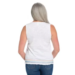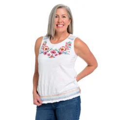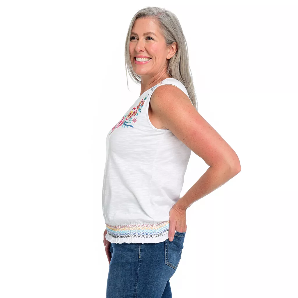 Get festive in the happy colors on this top! Textured embroidery brings these beautiful patterns to life. The smocking on the straps and hemline offer stretch and help keep this tank in place, on a lightweight and breathable cotton fabric.