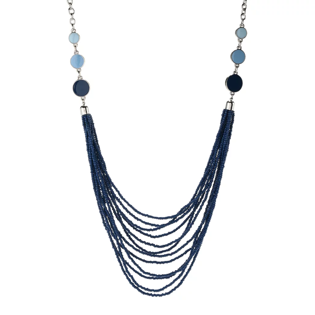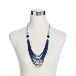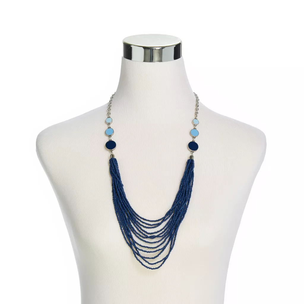 3 shades of blue circles gradient down to a blue seed beaded multi-strand necklace.