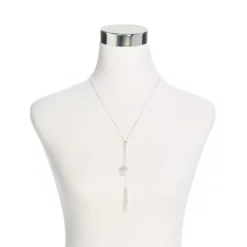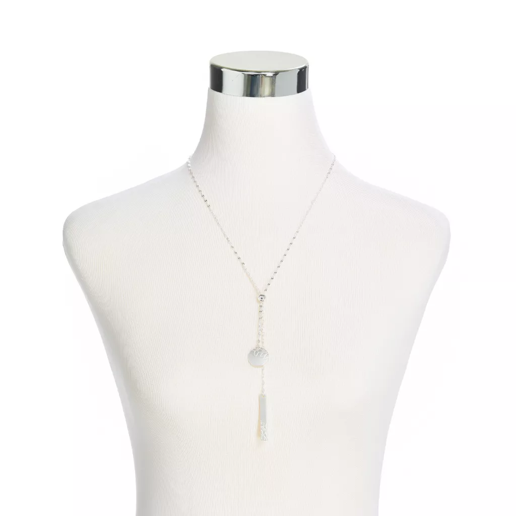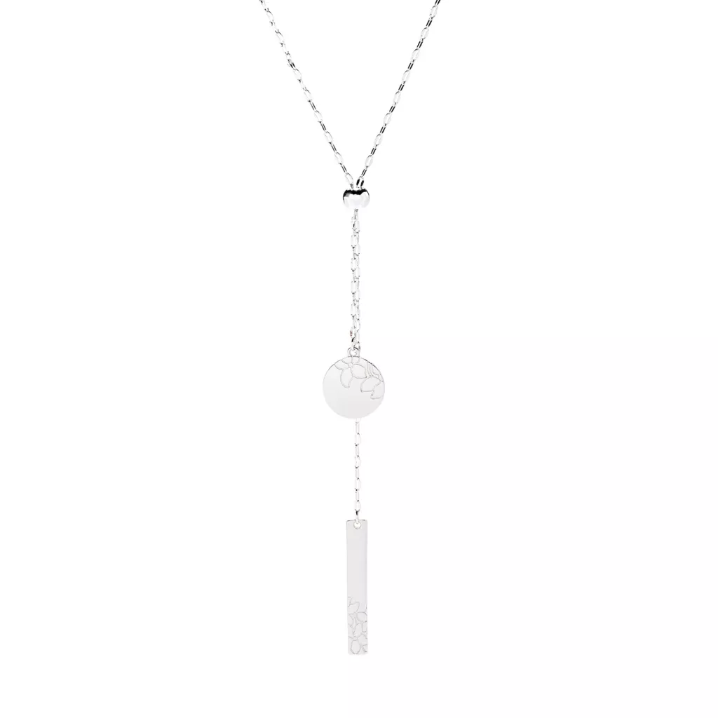 Etched-in flower shapes adorn the metal pieces of this flattering y-neck necklace.