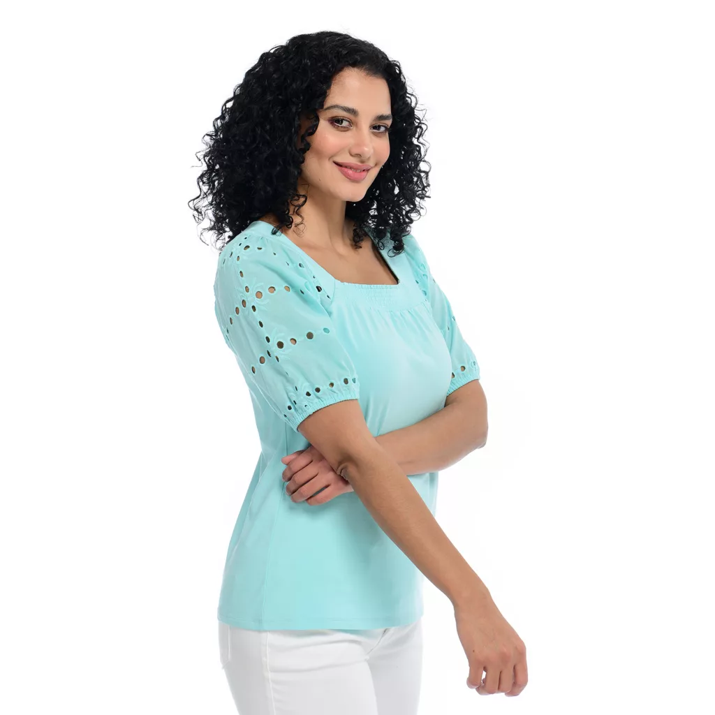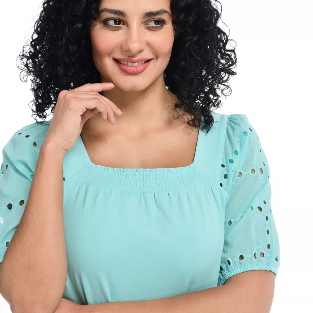 We’ve got “eye-lets” on you! For a fun and breezy spring look, this Short Sleeve Square Neck knit is for-your-eyes-only (not really, but you get the idea!). Breathable, easy to style, and the perfect top for the fast-approaching spring season.