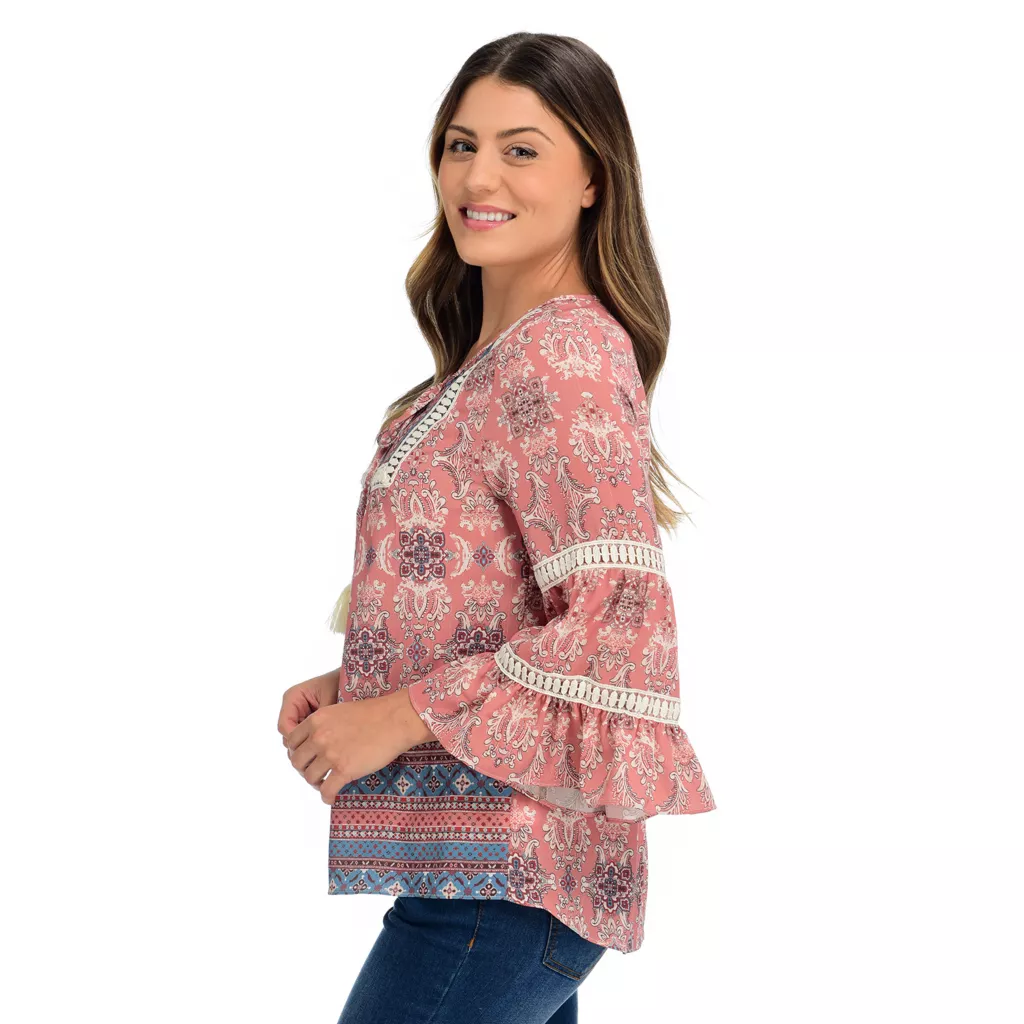 Easy to wear, this One World blouse brings a fun touch to your wardrobe with metallic threading, border prints, and crochet trim! Featuring bell sleeve and tassel details, this top brings movement and style to your typical silhouette. Pair this blouse with your favorite One World stretchy denim for an effortless and eye-catching look.