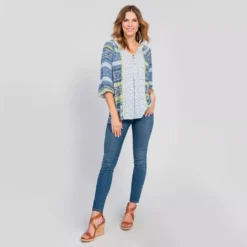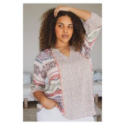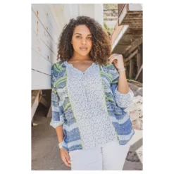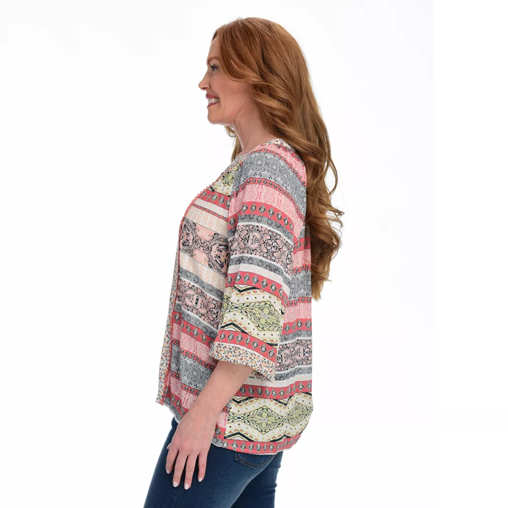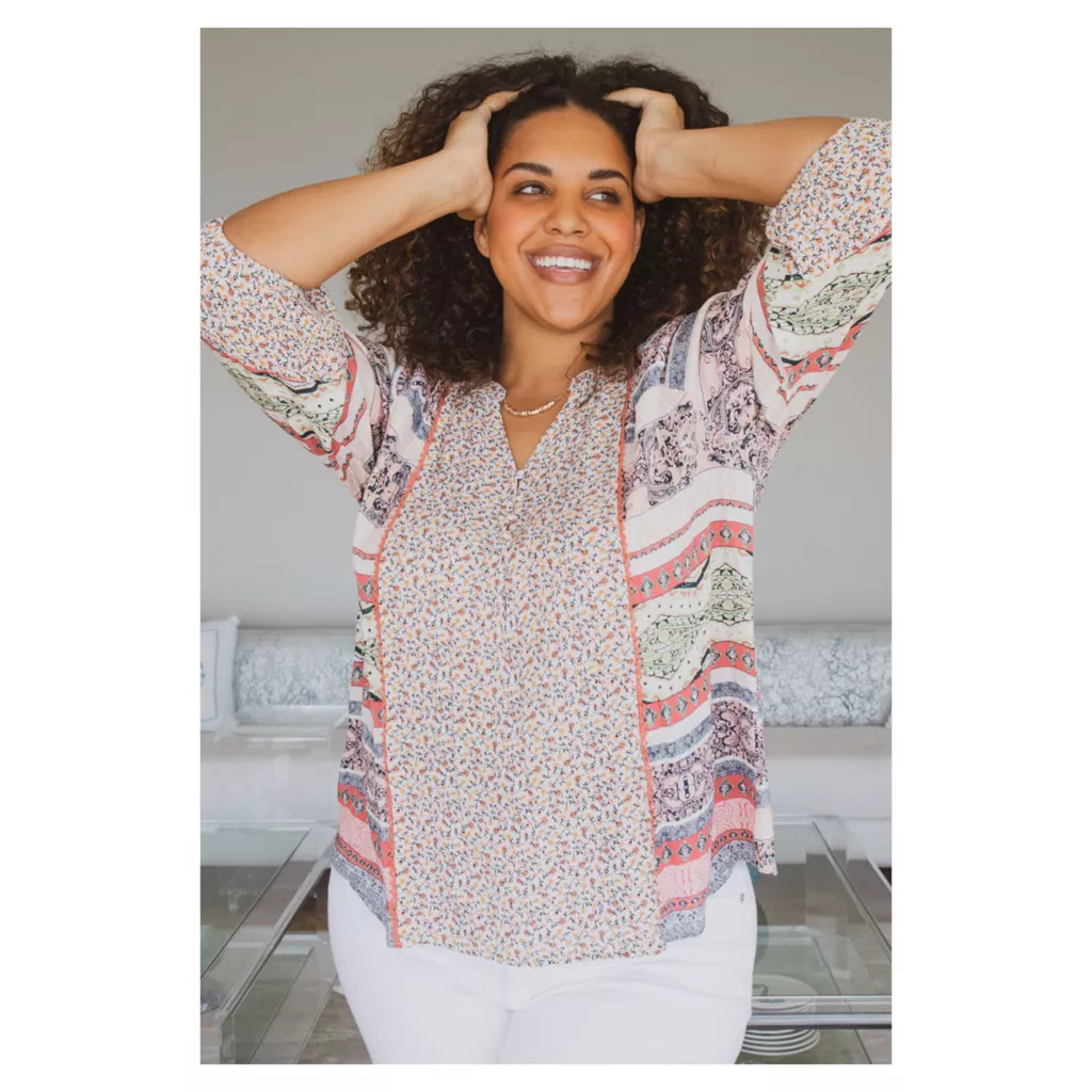 Farmers Market by One World brings you a beautifully feminine mixed media print blouse. This fun mixed media print is just enough without being too much! Also, all prints from Farmers Market are one of a kind so don’t miss your opportunity to rock this fun print! Pair this blouse with a pair of your favorite jeans or leggings for an effortless look without sacrificing comfort.