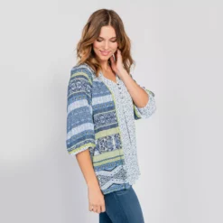 - Silhouette: 3/4″ BUBBLE SLV NOTCH NK HENLEY TWIN PRINT TOP