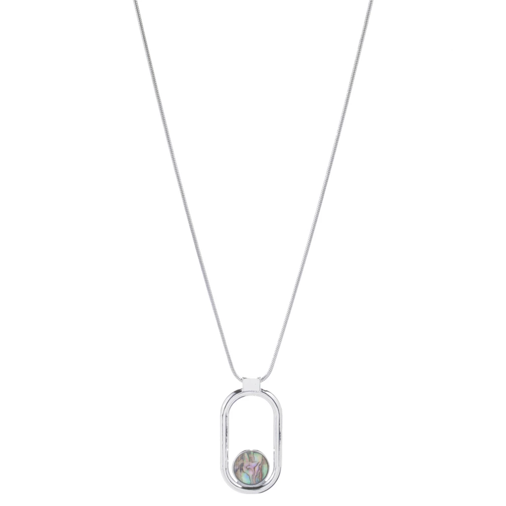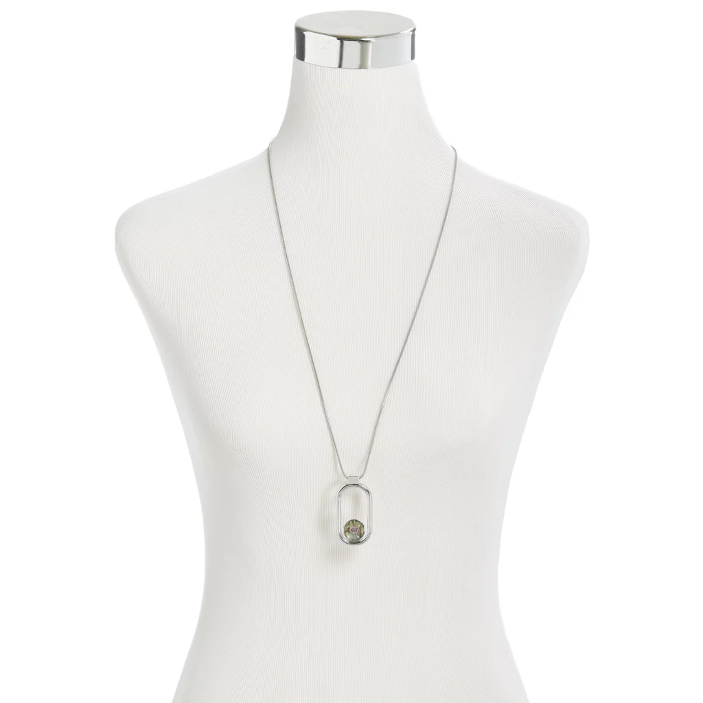 Faux abalone stone mimics the look of a stunning sea shell, set in an oblong shaped pendant on a sleep snake chain. Matches all shades of green and blue.