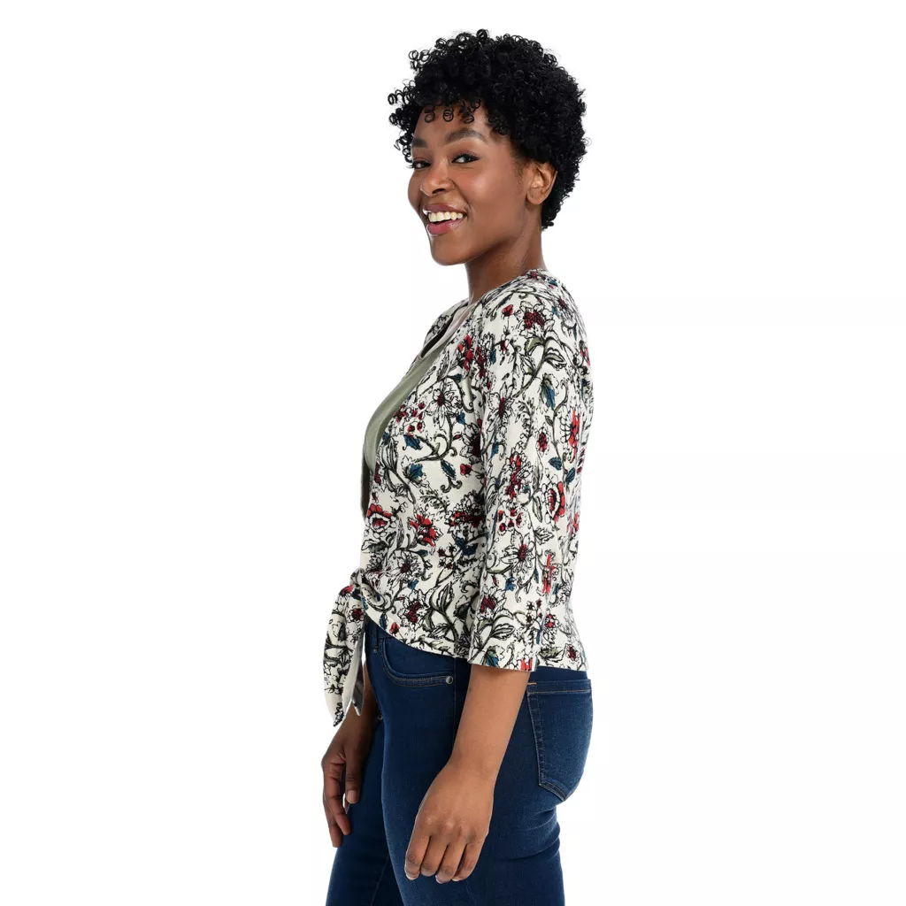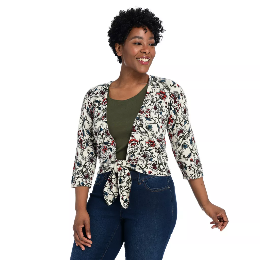 Add a twist to your cardi collection with this tie-front sweater! The lightweight cotton fabric makes for a great breathable layer with a C&B exclusive floral print. Easily pairs with white or denim jeans, for summer, fall, and beyond!