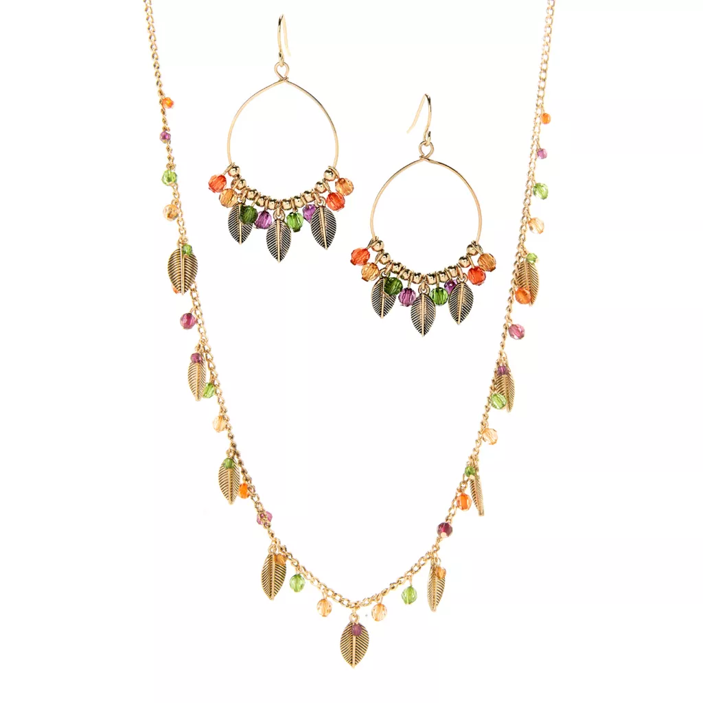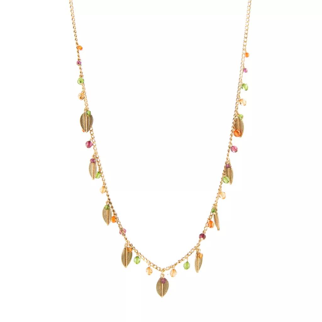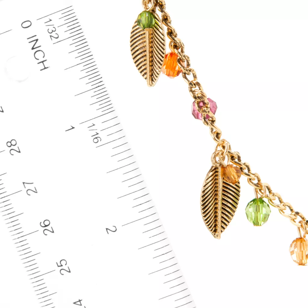 - Leaves and beads hang on a curb chain. Great length to wear with all sorts of tops.