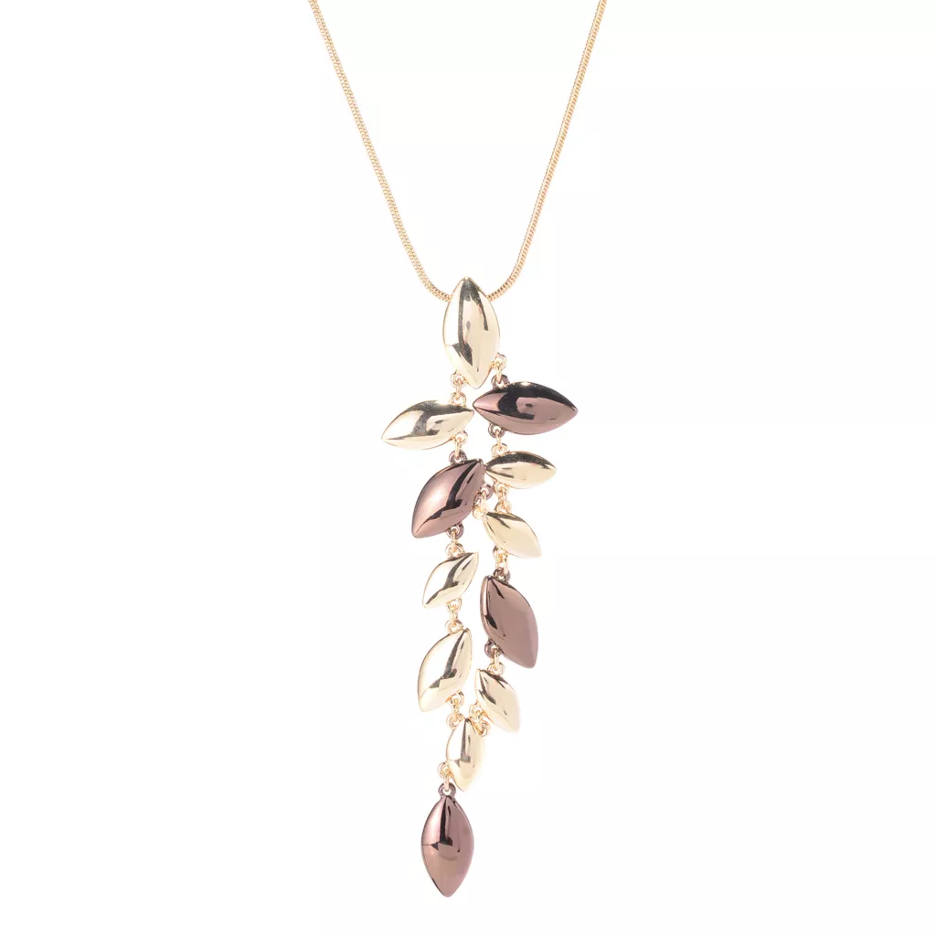 Turn heads with this earth-tone finishing touch. Smooth gold and chestnut-colored leaves drip down into an abstract vertical shape that intrigues the eye. Lightweight and pairs great with any neckline shape, making your favorite neutral outfits pop. Sleek snake chain makes it easy to wear with your favorite sweater as it won’t snag on any fine fabrics or loose threads.