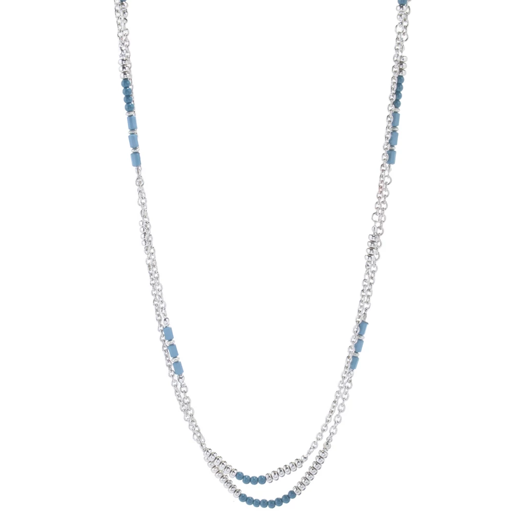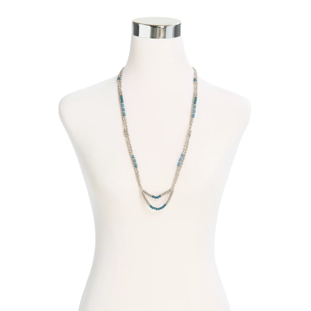Beautiful two-tone necklace with various bead styles and shapes to add textural interest to any solid or patterned blouse, sweater and tee!