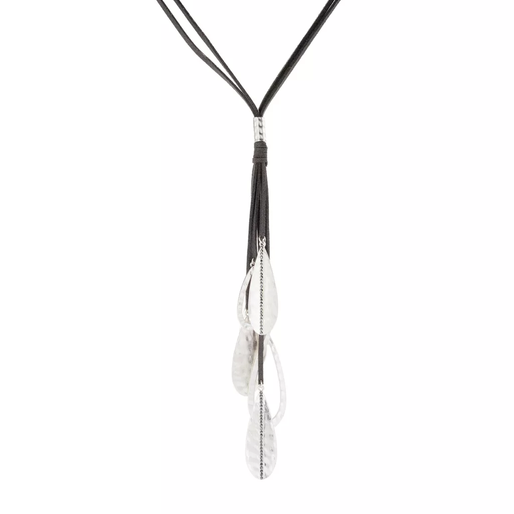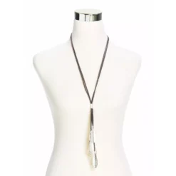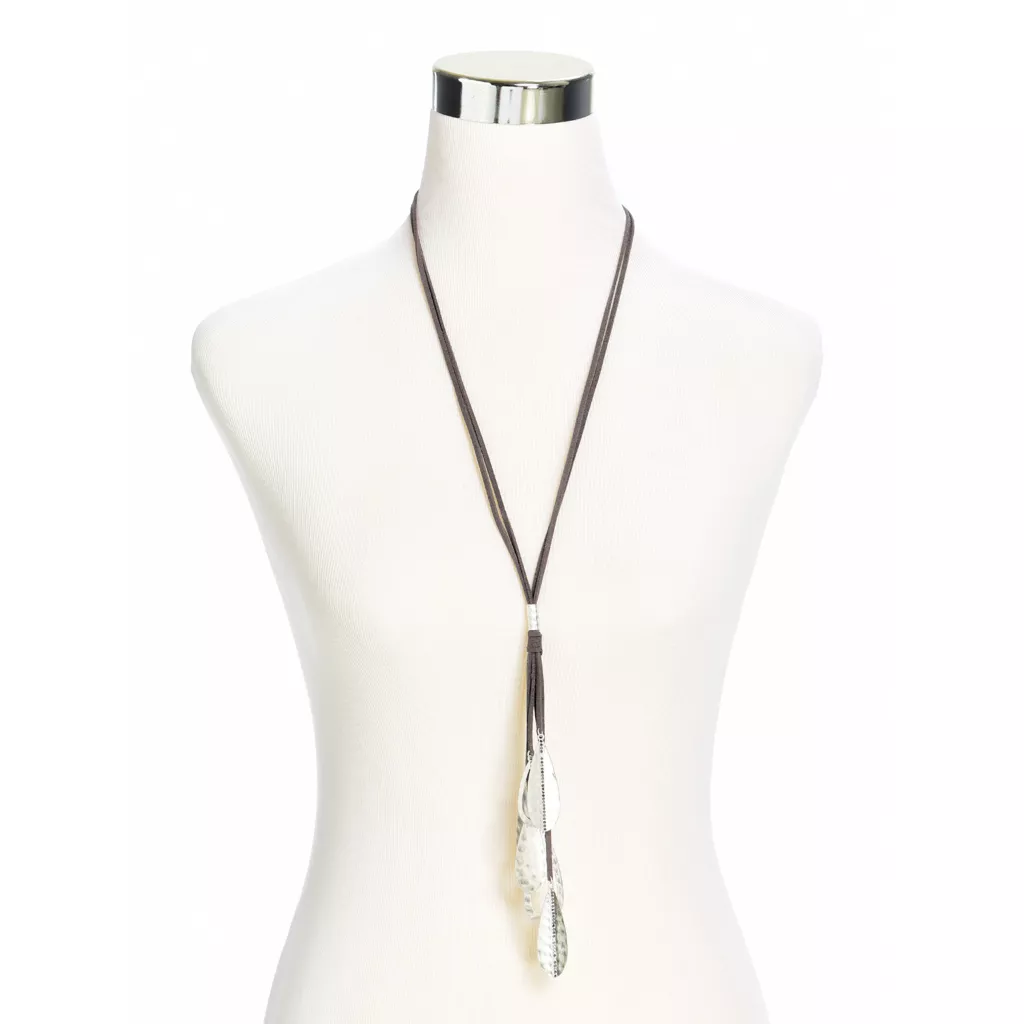 Teardrop-shaped discs dotted with shimmery rhinestones create a feather-like look with mixed textures for a truly unique necklace.