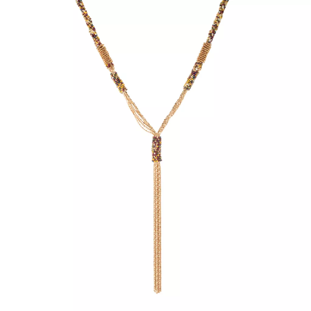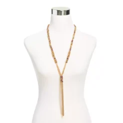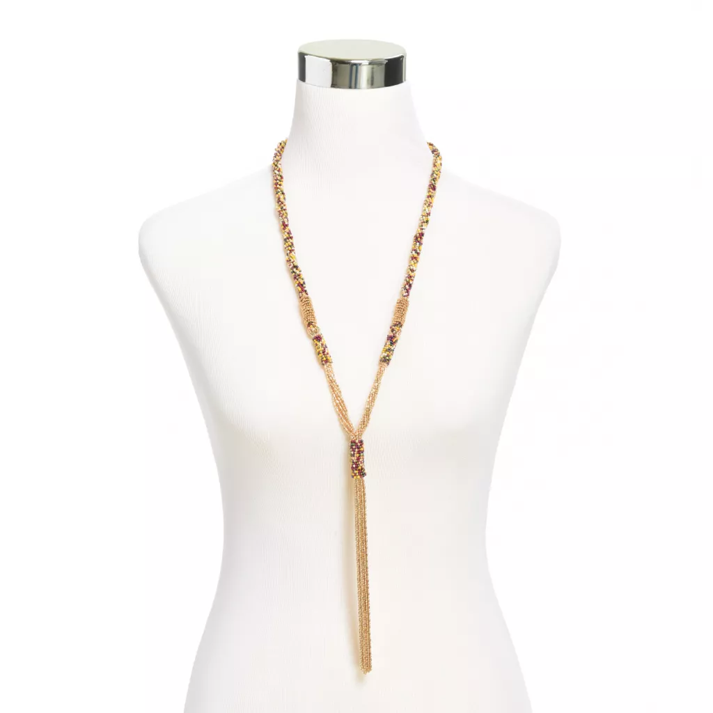 Fall-fest colors combine with warm gold to add a splash of elegance to your outfit. Y-neckline shape accentuates a variety of tops, from turtlenecks to v-necks!