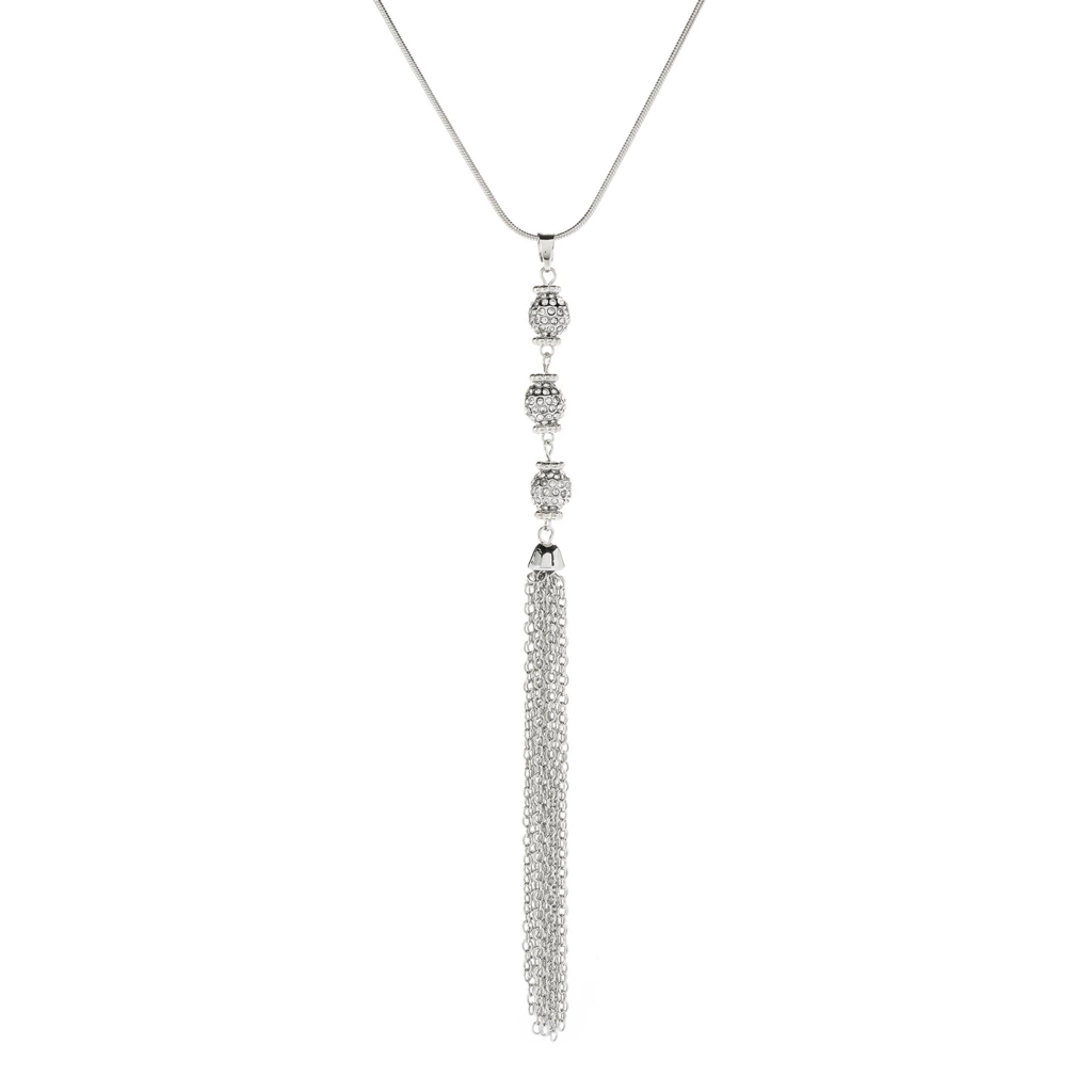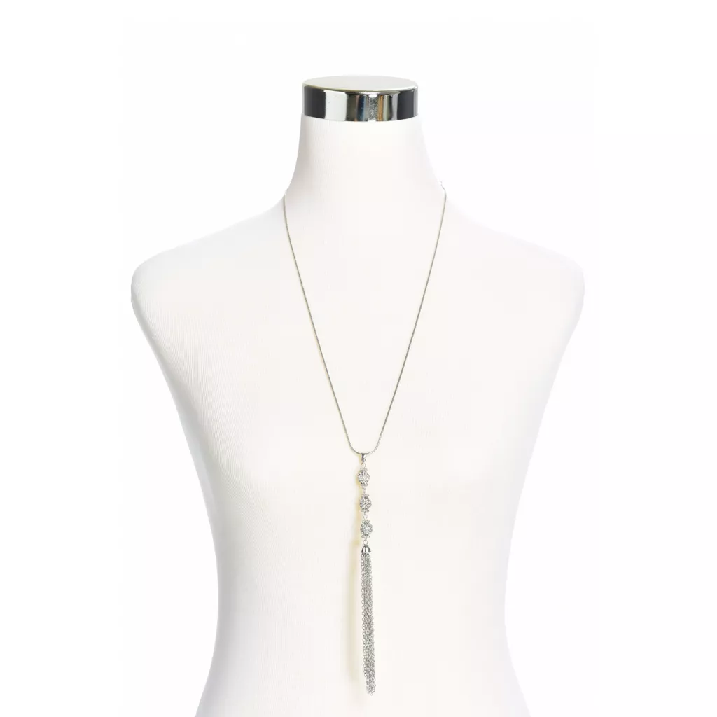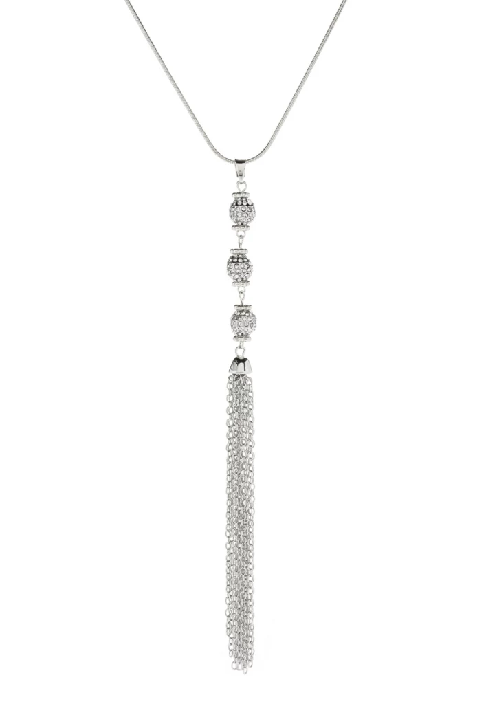 Exude radiance with this tassel necklace to complete an occasion-ready outfit. Three sparkling spheres dangle above a long metal tassel for a long, vertical look that creates a flattering line.