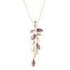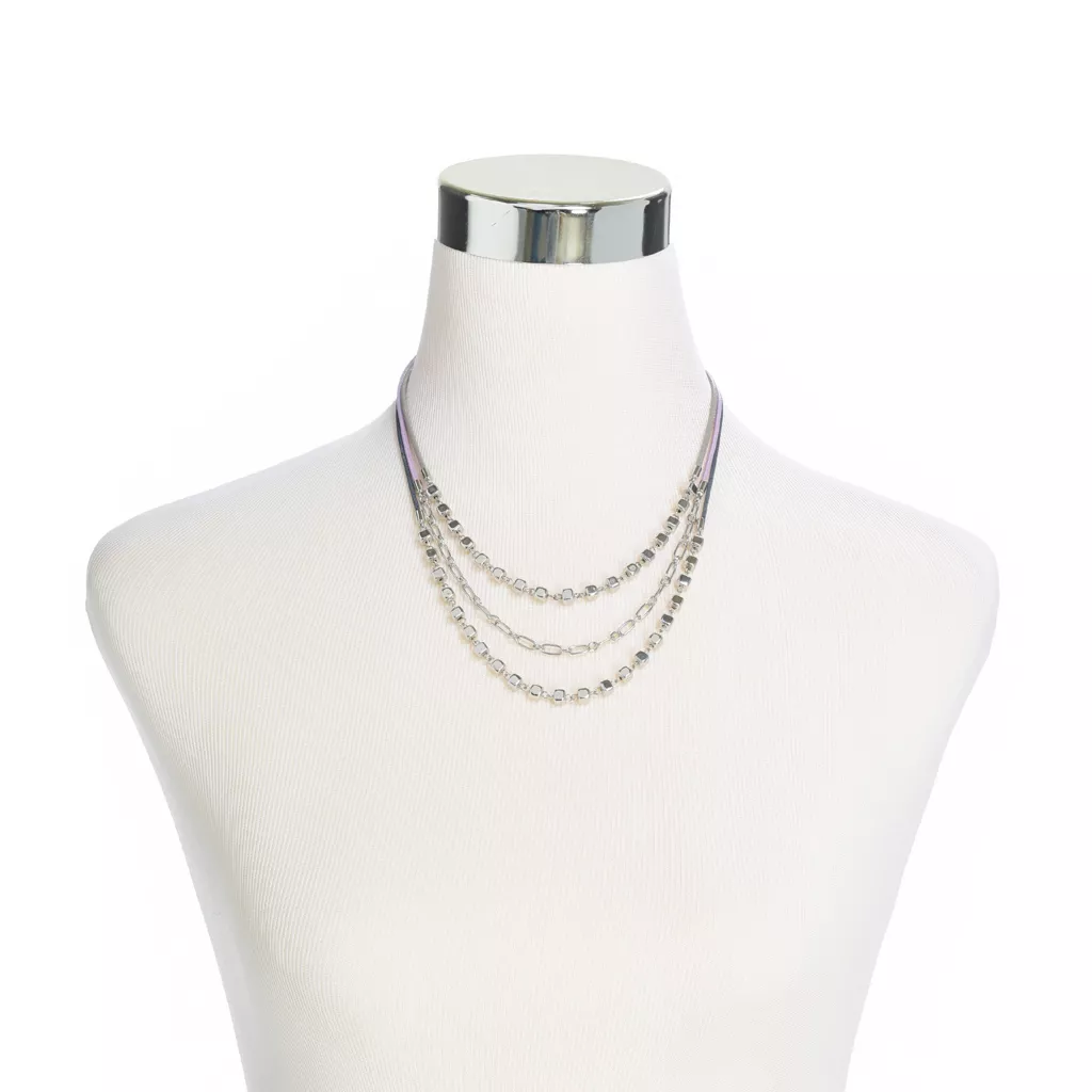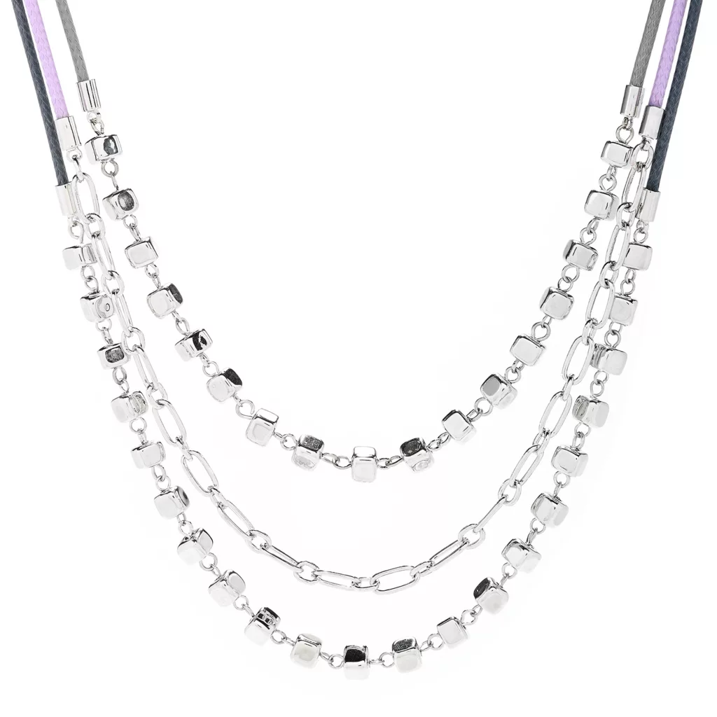 Add a fun pop of color with the 3 shades of purple decorating the cords on this necklace.