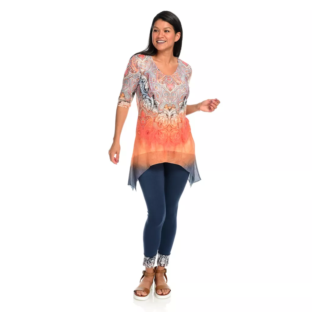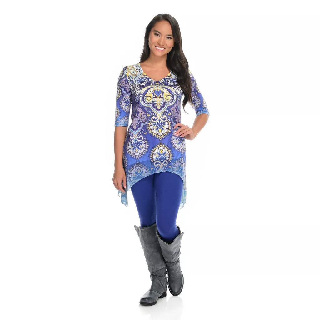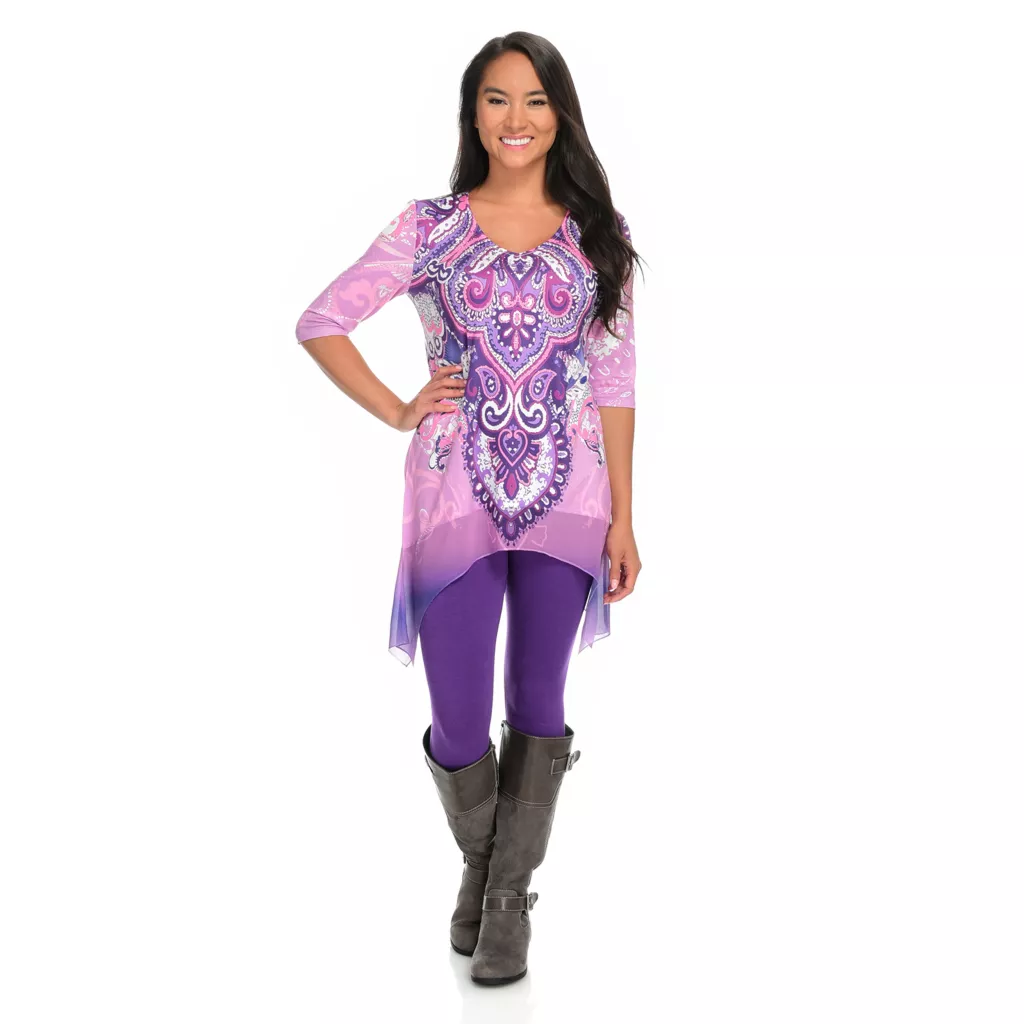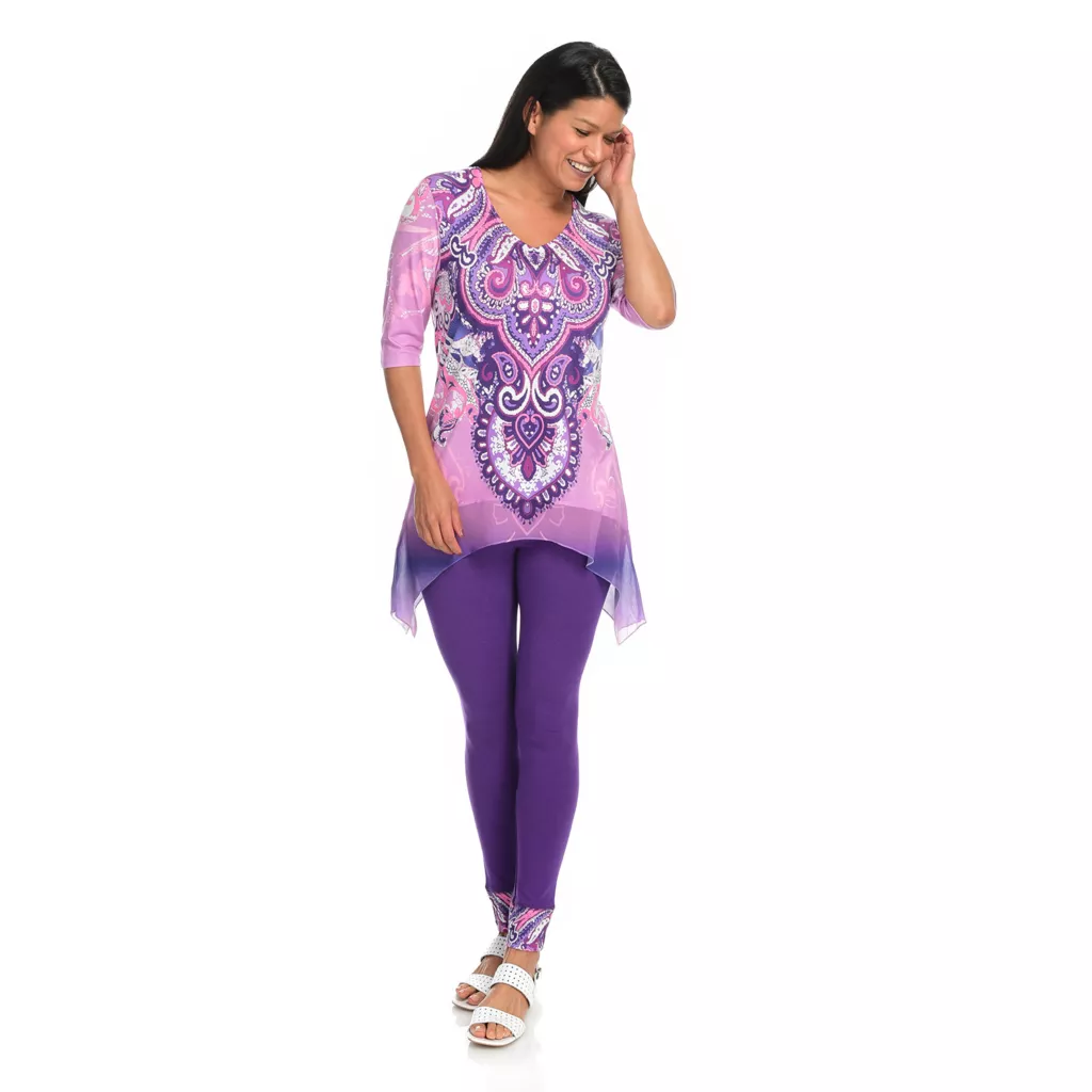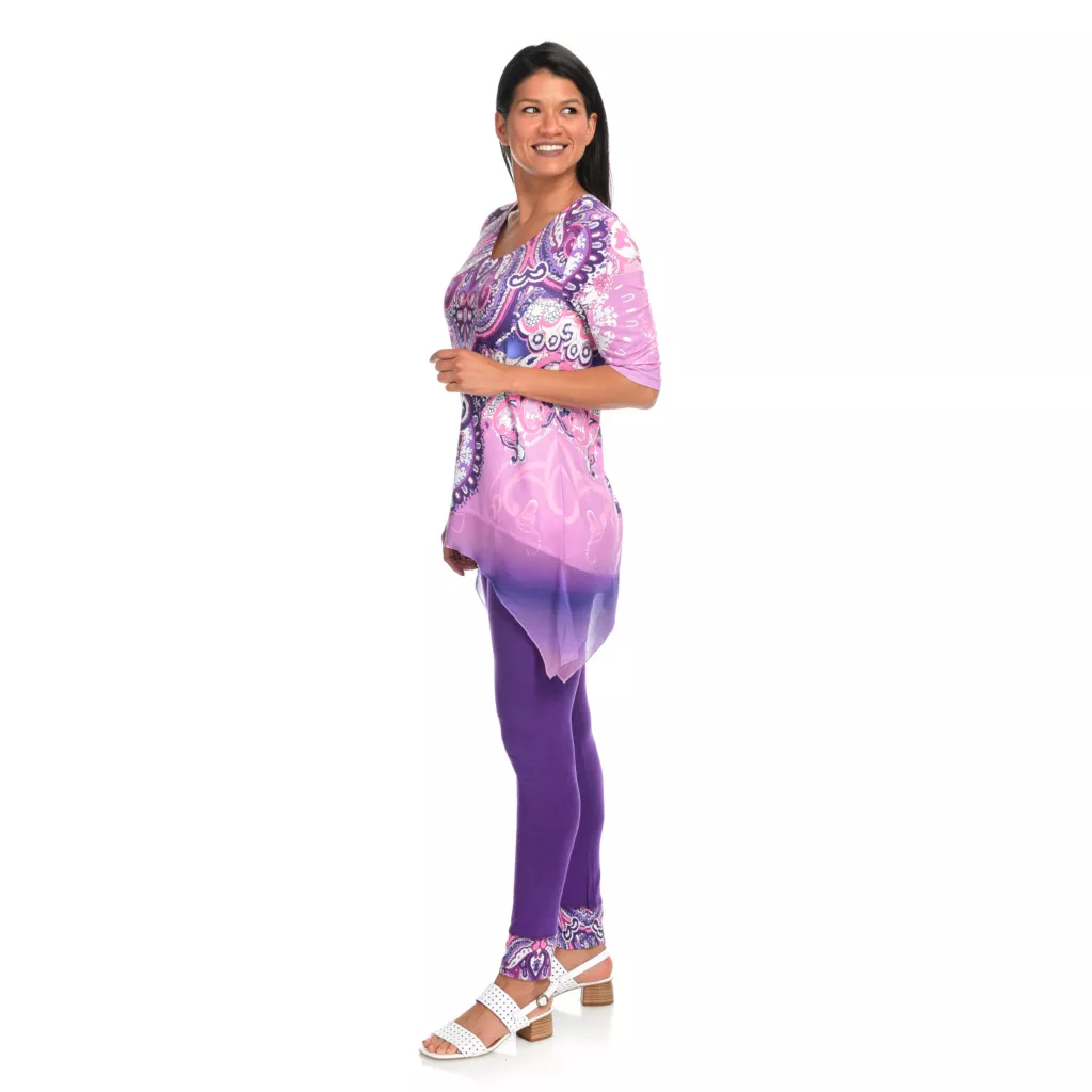One World gives you one less thing to think about with this sensational set! You’ll be stylish without the “does this go together” guesswork that goes into building an outfit by donning this chic coordinating top and leggings pair. The top is made of a super soft knit fabric that’s jazzed up with semi-sheer chiffon trim and embellishments along the scoop neckline. The allover print is tied in by matching cuffs on the included leggings which are the perfect in-between length for transition seasons!