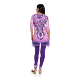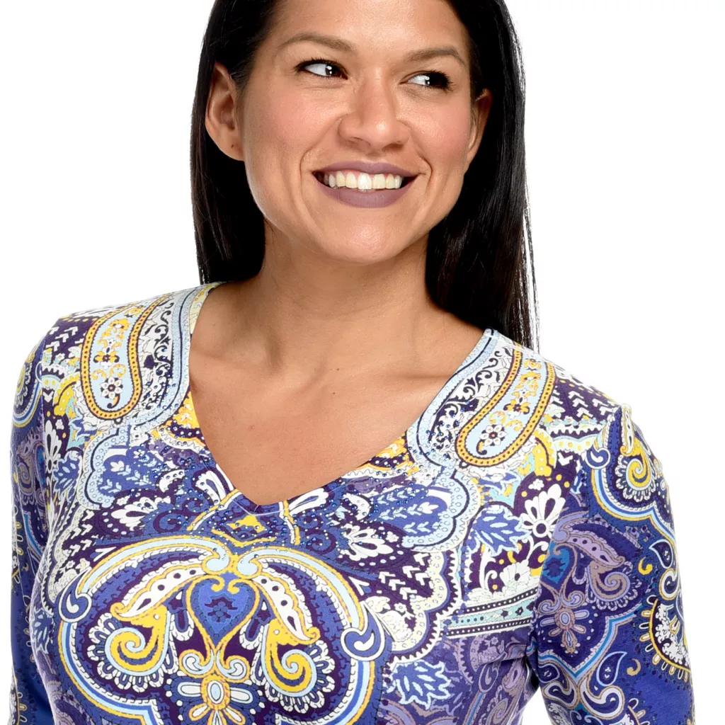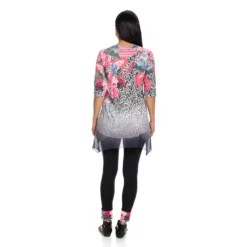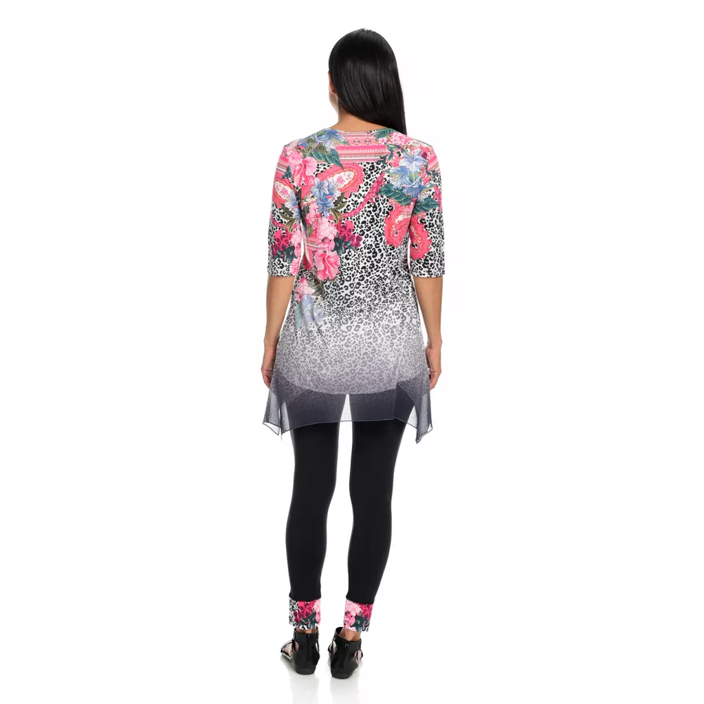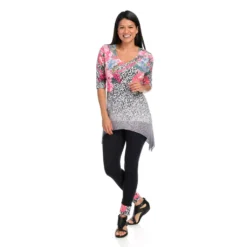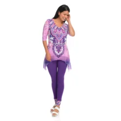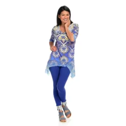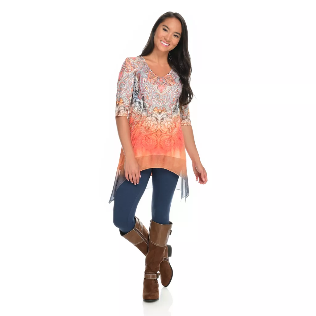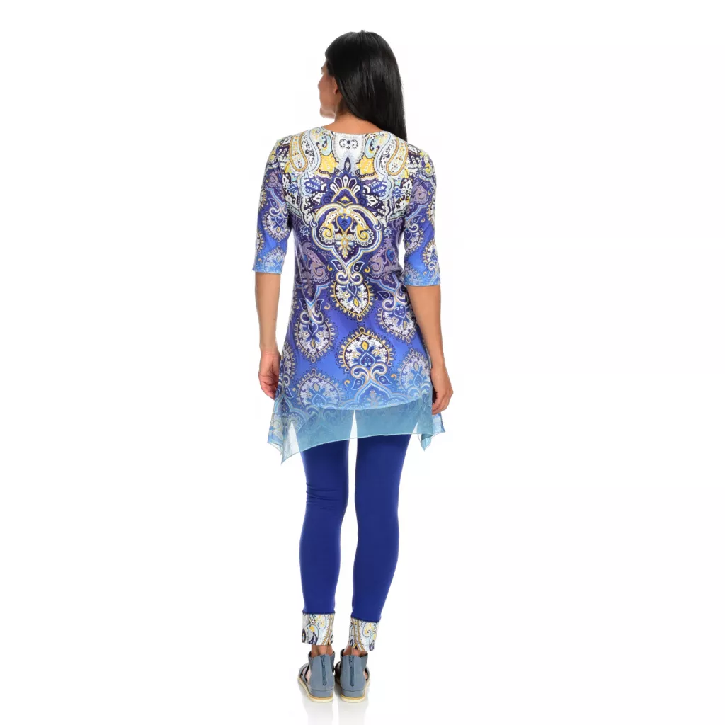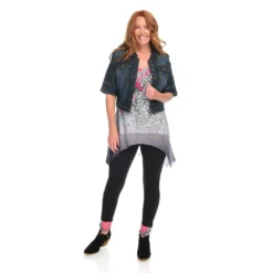 One World gives you one less thing to think about with this sensational set! You’ll be stylish without the “does this go together” guesswork that goes into building an outfit by donning this chic coordinating top and leggings pair. The top is made of a super soft knit fabric that’s jazzed up with semi-sheer chiffon trim and embellishments along the scoop neckline. The allover print is tied in by matching cuffs on the included leggings which are the perfect in-between length for transition seasons!