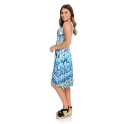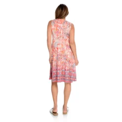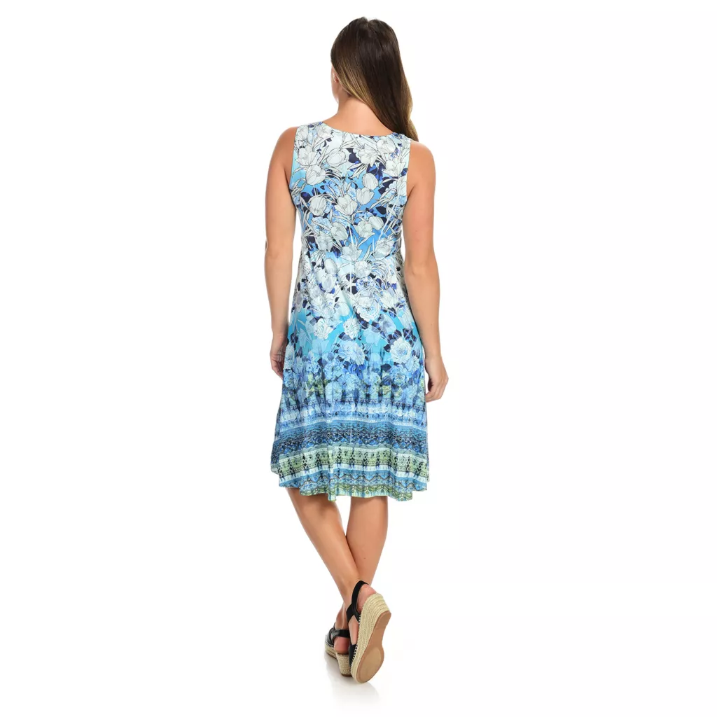 Dance the night away with One World! Sleeveless and sassy, this dress features a soft knit feel and just enough sparkle for you to stand out from the crowd. Easy and flowy, there’s no way you’re sitting the next one out with a blend of beautiful shades sprayed and speckled throughout and a dramatic v-shaped neckline. Shining studs swirl along the neckline as an a-line silhouette flatters your figure. Grab a drink and take a breather with this little knee-length number turning heads all the while.