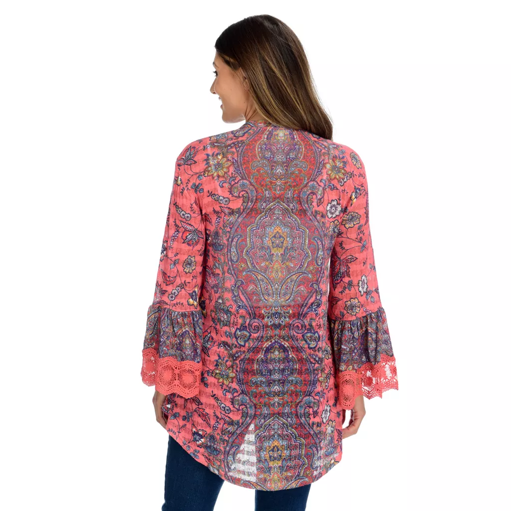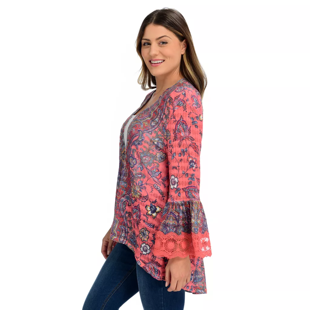 An effortless all over print decorates the pointelle knit of this gorgeous One World cardigan to level up your layering game. Fun details incorporated into the mix print bell sleeve and crochet trim make this piece easy to wear and so chic! The high-lo hem is the perfect pairing with your favorite One World leggings for a casual but stylish look.