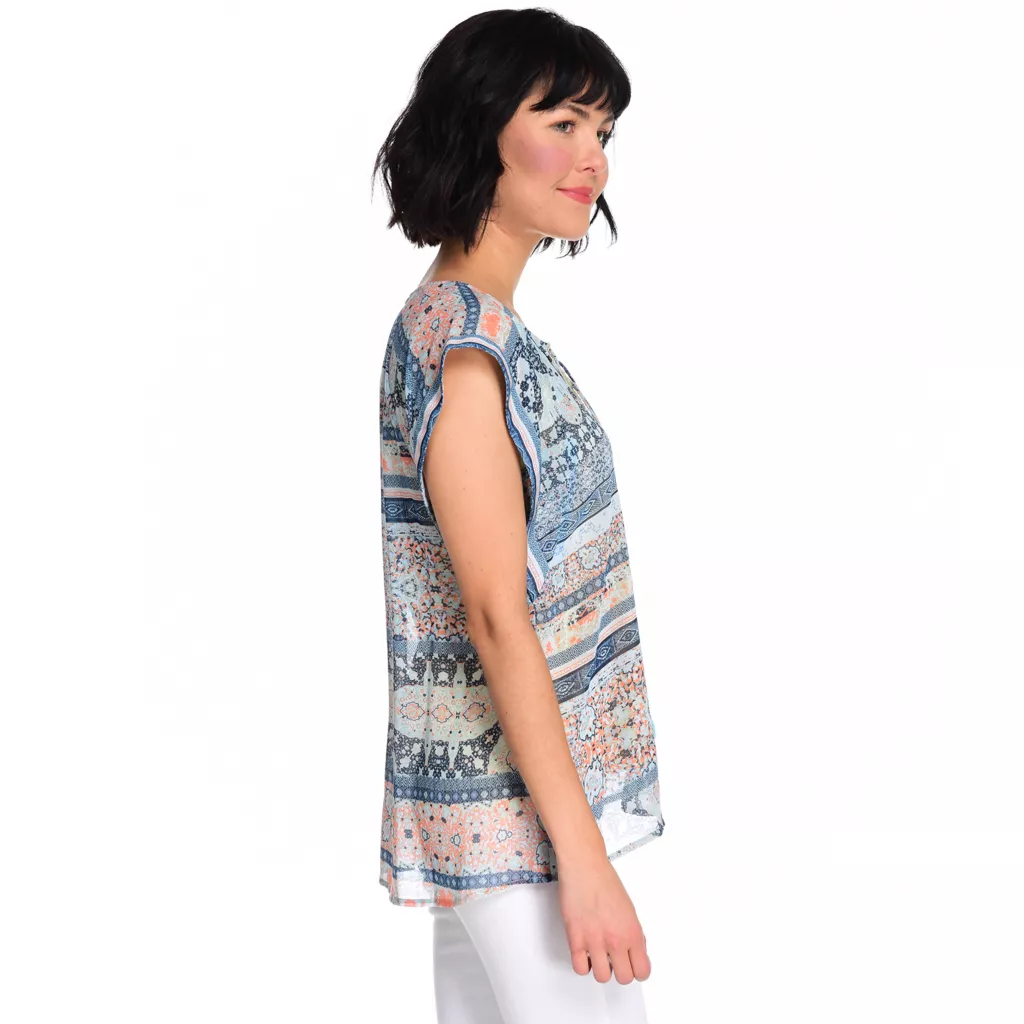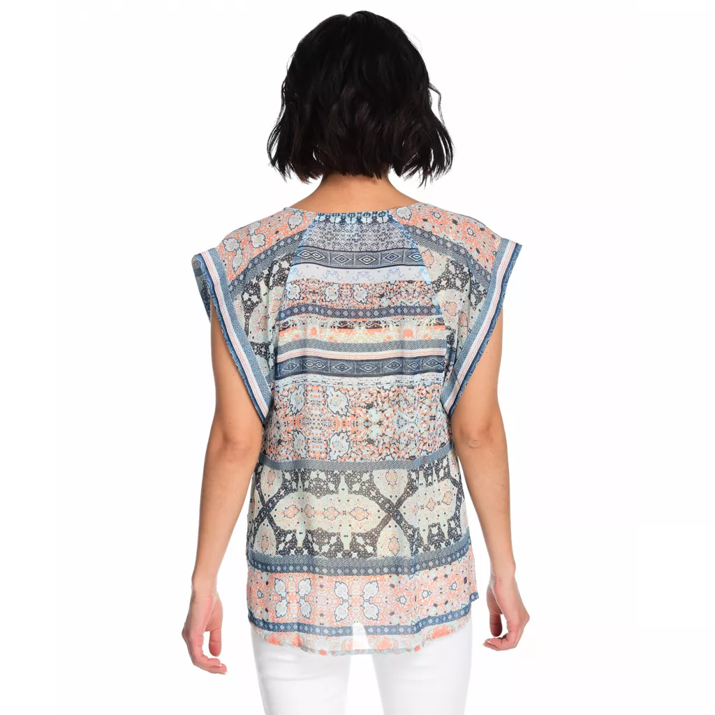 One World delivers a fabulous and flowy design that’ll have you standing out from the crowd (in a good way)! Its lightweight chiffon fabric is printed with a mixture of vibrant patterns that work together to make a cohesive statement. Design-wise, the short sleeve top features a notch neckline that’s decorated with sequins and equipped with tassel ties.