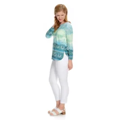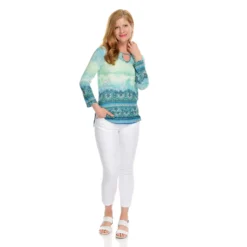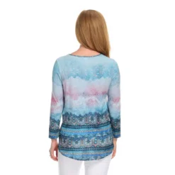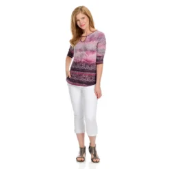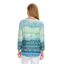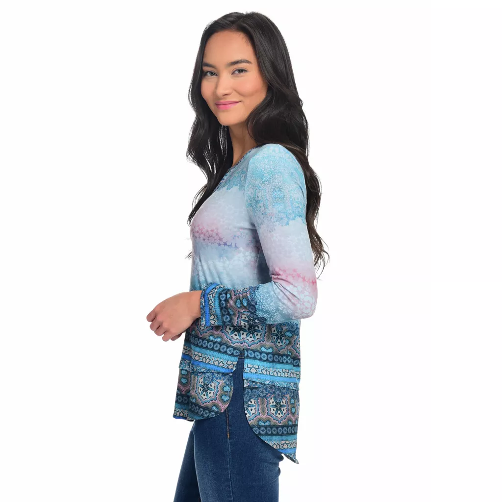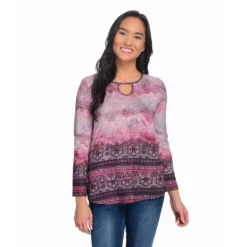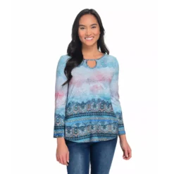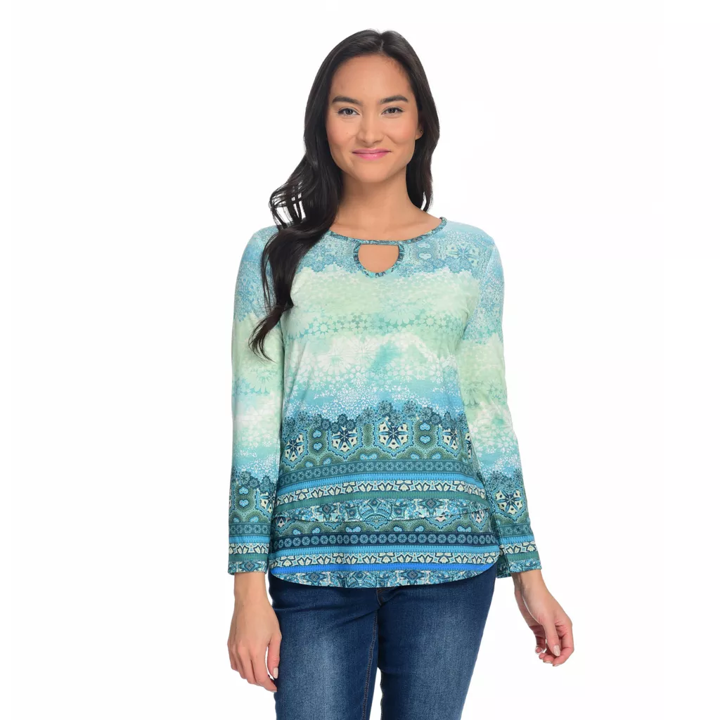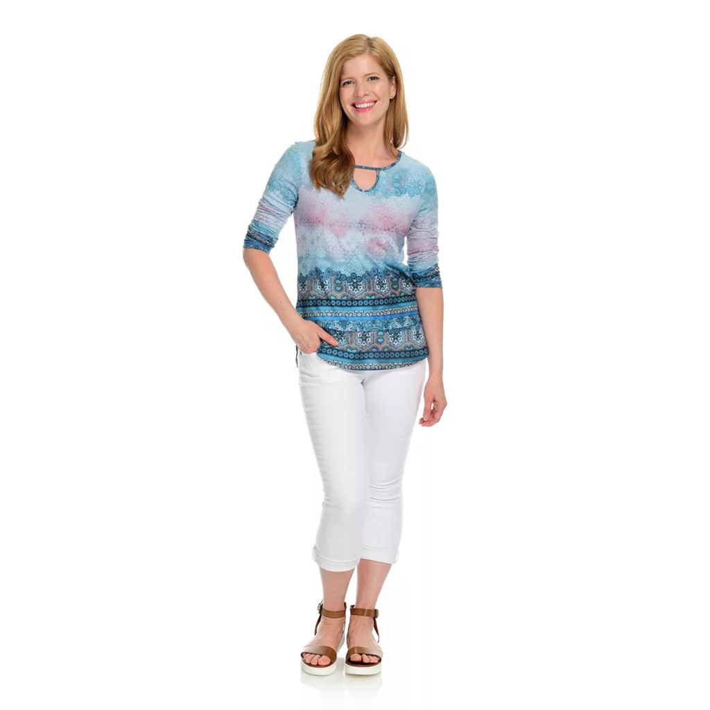 Stand-out stylishly in this keyhole top from One World! Most of the top is a soft knit fabric, however, chiffon woven trims the hemline in a layered-looking fashion. A mix of prints seamlessly cover both fabrics, giving it an eye-catching appeal. Rock it with your favorite pair of jeans for a can’t-go-wrong chic and casual look!Â
