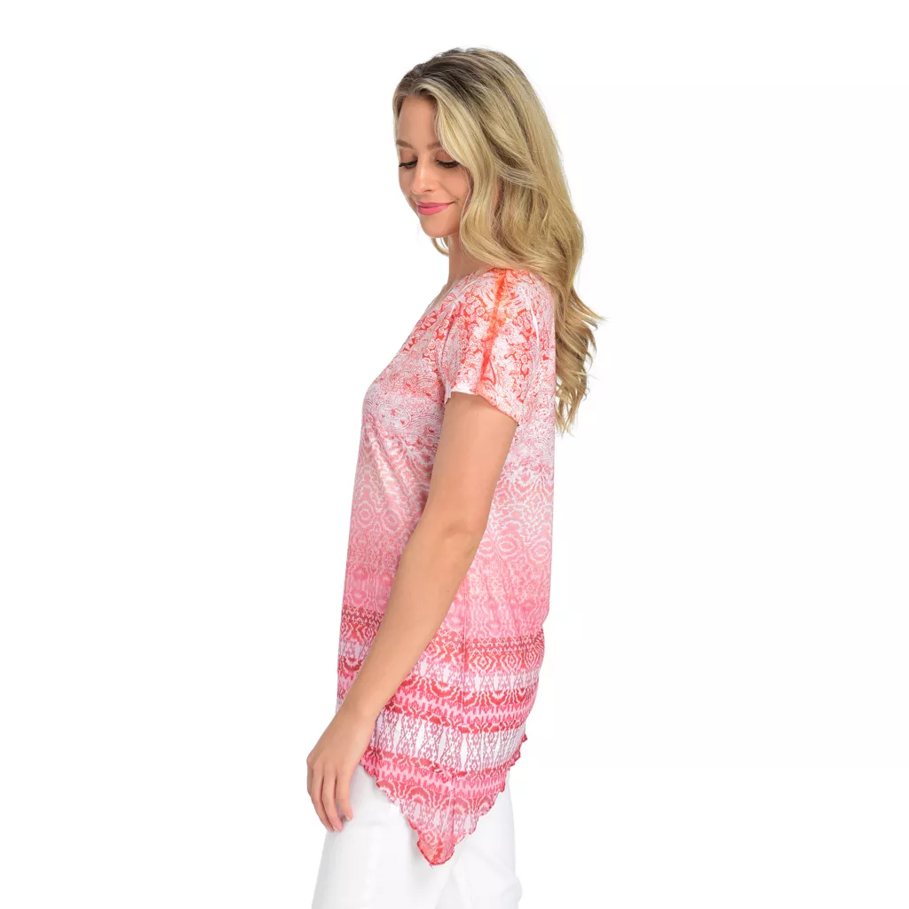 What better way to jazz up your outfit that a pop of print?! This One World number does just that with the mix of prints that cover its soft knit and mesh fabrics. The mesh trims the top’s sharkbite hemline and imitation stones decorate the chest. Rock it with your favorite pair of stretch denim jeans for a look that’s as stylish as it is comfortable.Â