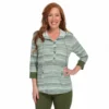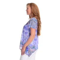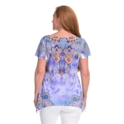Colorful prints and a distinctive fabric duo come to play in this One World top! A satin trim decorates the square neckline which dazzles with heat stud embellishments. A flutter cap sleeve offers coverage while still maintaining a light feel overall. Its a-line body finishes in a sharkbite hem for even more visual appeal. You’ll love pairing this top with leggings or cut-off denims and your favorite strappy sandals!