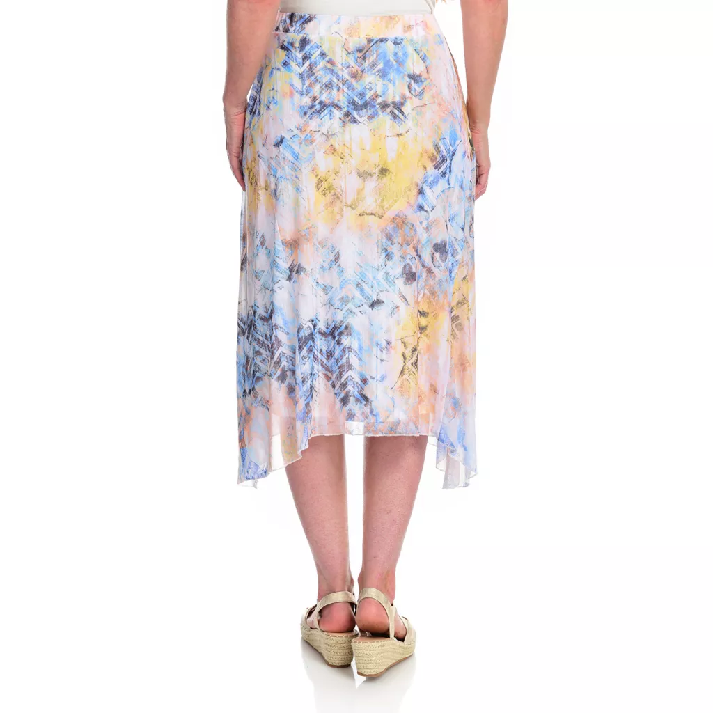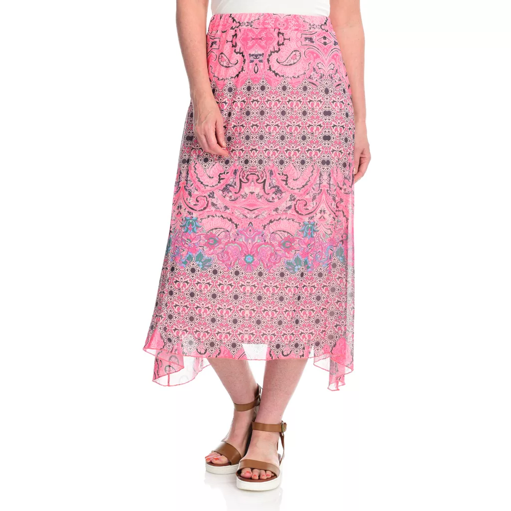 A figure flattering fit and a comfy fabric combo makes this skirt from One World a must-have add to your wardrobe! The stretchy mesh complements an elastic waistband that allows its a-line skirt to flow down to a sharkbite hem. Knit lining maintains modesty and offers coverage in this midi length skirt.