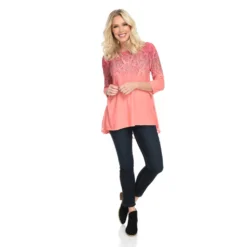 - Silhouette: 3/4 sleeve scoop neck bustle back tee