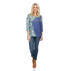 Everywhere you look, this One World top is going to catch your eye! From its refreshing array of prints to the rhinestone embellishments throughout, this top is here to make sure your outfit shows off your sparkling personality in any season. The silhouette of this piece garners interest as well with a hi-lo hem featuring a sheer bustle detail in the back. Along with a scoop neck and 3/4 sleeve length, this top has a very flattering body and is great for wearing alone or layering under a jacket.