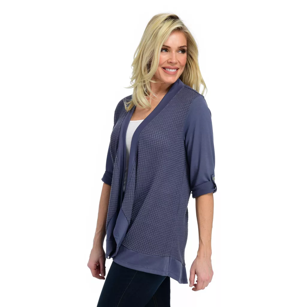 This rib knit sweater cardigan from One World is a must-have staple piece for your wardrobe! Easily layer over your favorite top for a little extra warmth and a complete, put-together look. Features include a 3/4 sleeve roll tab sleeve and a soft, lightweight rib knit, making this the perfect transitional cardigan to wear through all seasons!.