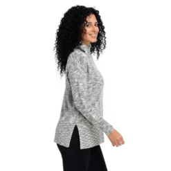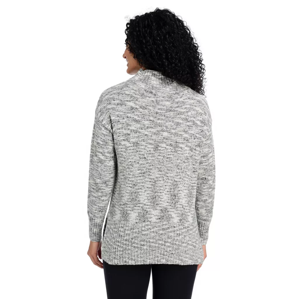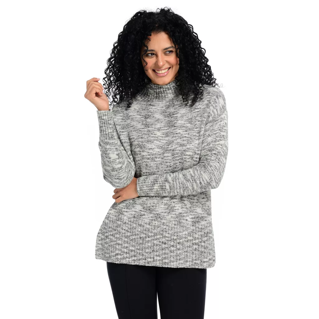This blended effect is termed “space dyed,” and it is oh-so fitting because this cardigan is out of this world! This turtleneck is warm and comfortable without being too hot, and is a bit looser than the traditional concept. Tunic length makes this perfect to wear with leggings or Pontes and a pair of your favorite boots. Wear it to the office, to potluck, or just about the house for a cozy, comfortable, totally wearable look!