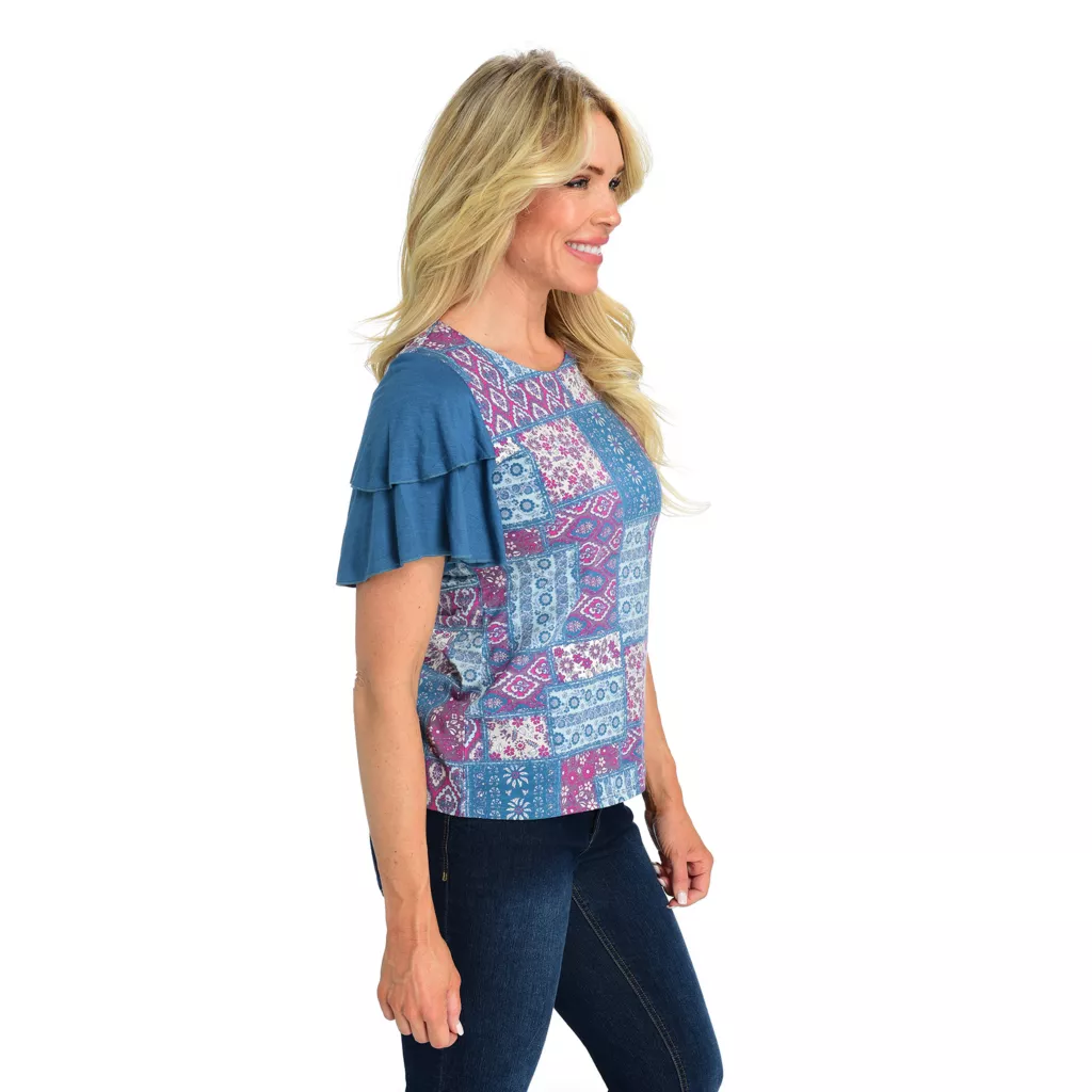 This flutter sleeve top is a bold and feminine look for the season. Unique prints mixed with solid colors are eye-catching yet easy to wear! Pair with your favorite Signature Slimming denim for a super flattering outfit.