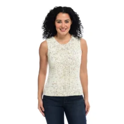 Multi-color tweed yarn brings feminine flair to this soft sleeveless sweater. The pointelle stitching up the front gives a lace-like appearance that’s easy to dress up or down. Wear this top with a white or colorful cami for an everyday summer sweater!