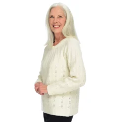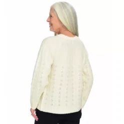 Dainty detail greets you in this sweater. Raglan sleeves give a relaxed look and feel with the sophisticated twist of the pointelle pattern. This pullover looks great with any wash of denim for every day wear and black trousers for a dinner out.