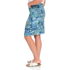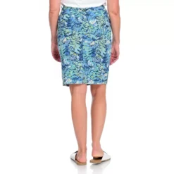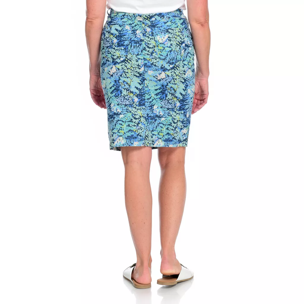 Mix it up with this printed denim skirt. The classic 5-pocket design with belt loops gets a twist in a fun blue-toned pattern. Pair with a Perfect Tee or solid blouse for a truly unique look!