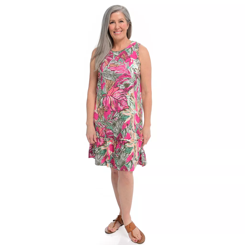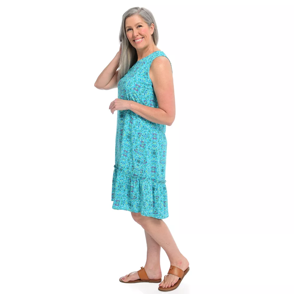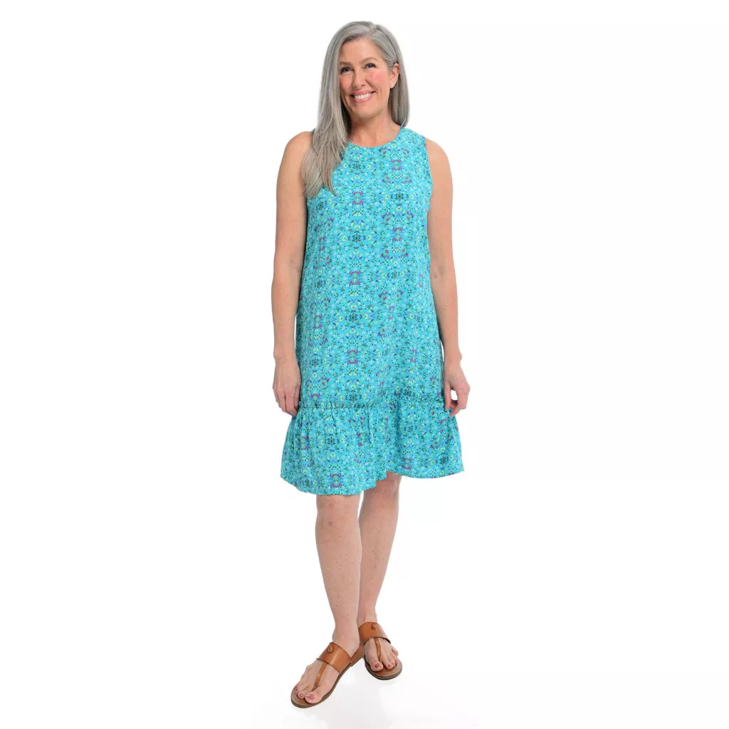 Our Printed Tie Sleeveless Dress is the perfect addition to your summer wardrobe. This dress features feminine tie details and a great drape on the body, providing both comfort and style. Made from lightweight materials, it will keep you cool in the summer heat. Perfect for any occasion, this dress is a must-have for the season.