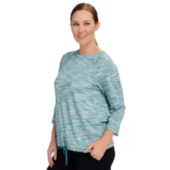 Comfortable and stretchy, this drawstring hem top is an on-the-go favorite. You choose how tight the hem is, from cinched to a relaxed fit. Space dye pattern gives this shirt a flattering blurred effect!