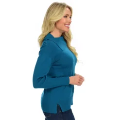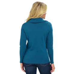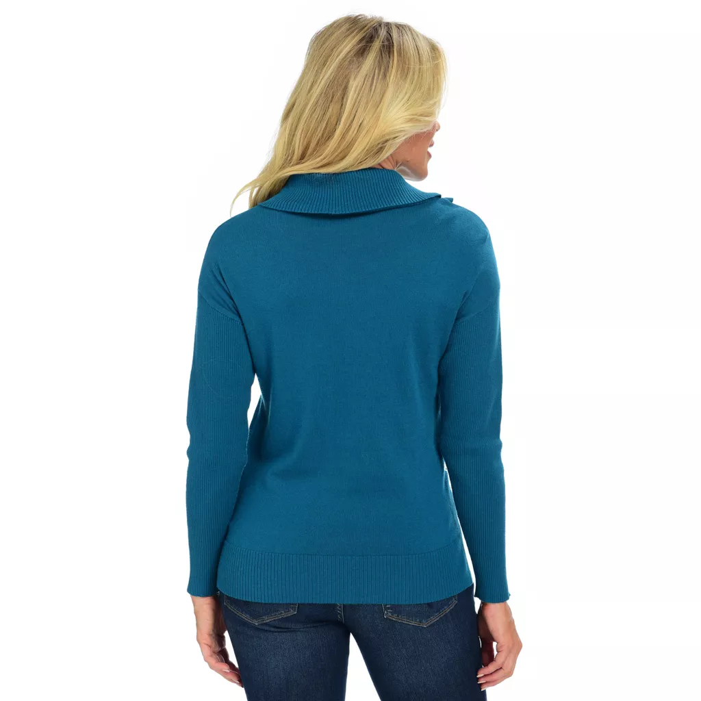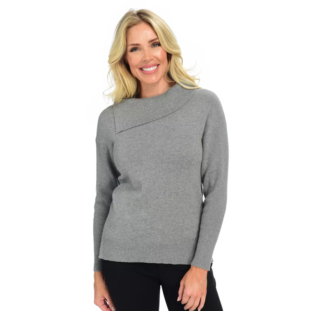 Don’t sacrifice style in this season’s cold! The gauge knit on this pullover makes for a warm sweater that’s thin enough to layer under a vest or jacket. Ribbing on sleeves, hem, and neck create a flattering shape, with stylish draped neckline.