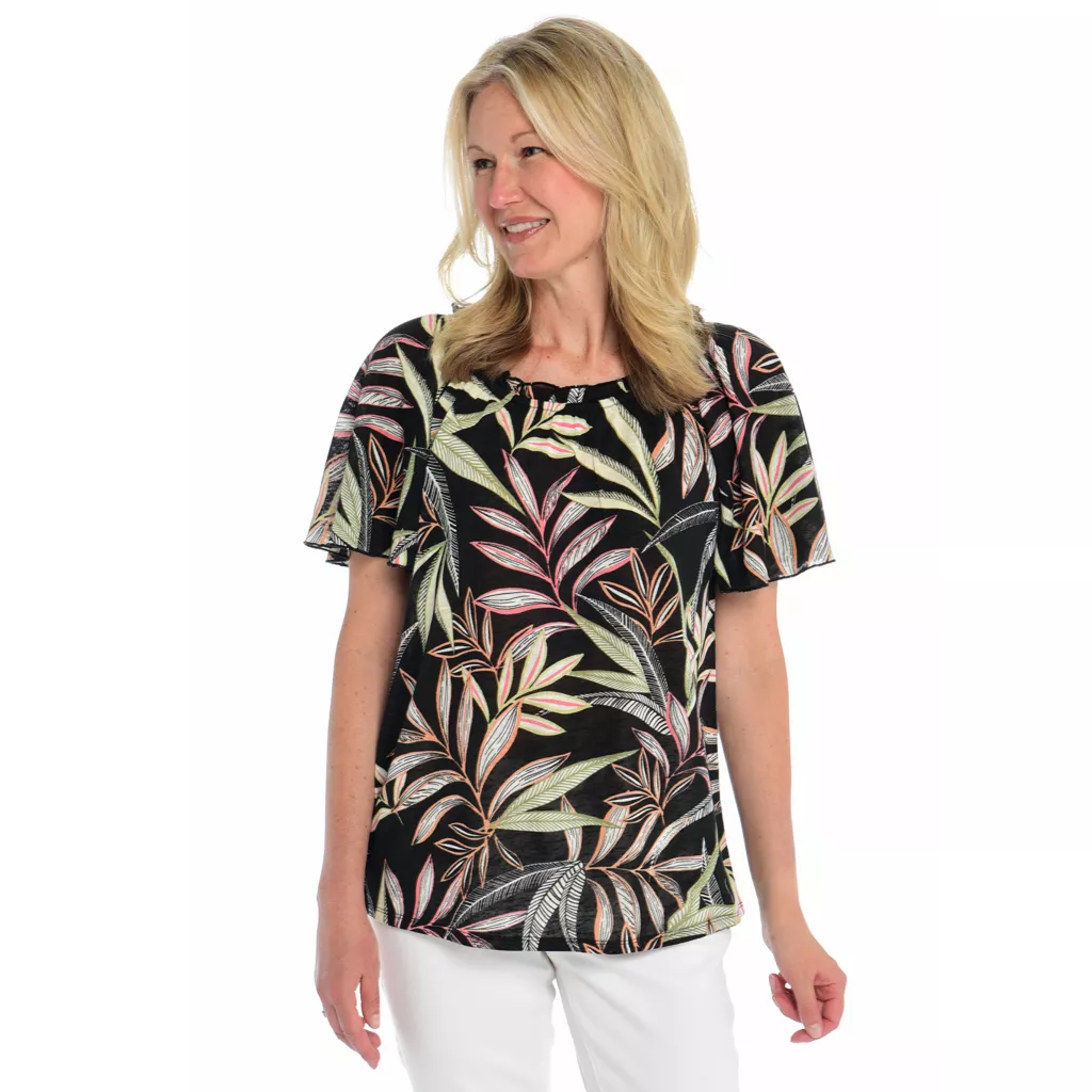 Introducing our Ruffle Neck Short Sleeve Flounce Top – a perfect blend of elegance and comfort. With its delicate ruffle neckline and flounce sleeves, this top adds a touch of femininity to any outfit. Made from soft, breathable fabric, it offers a relaxed fit that drapes beautifully. Dress it up or down, this versatile piece is a must-have for your wardrobe.