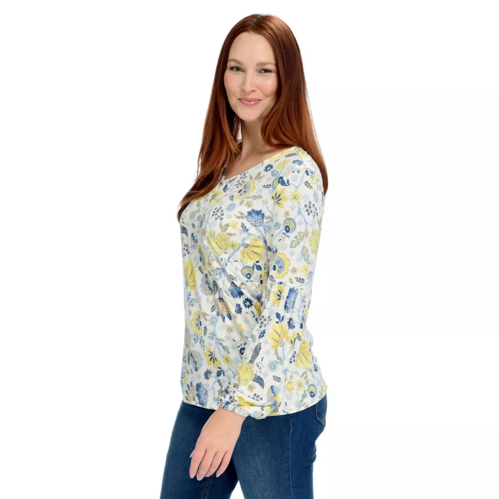 Supremely soft with details to delight, this shirred top features smooth buttons up the front and peasant sleeves with elastic cuffs. Lightweight material drapes great to showcase this in-house created print, exclusively from C&B!