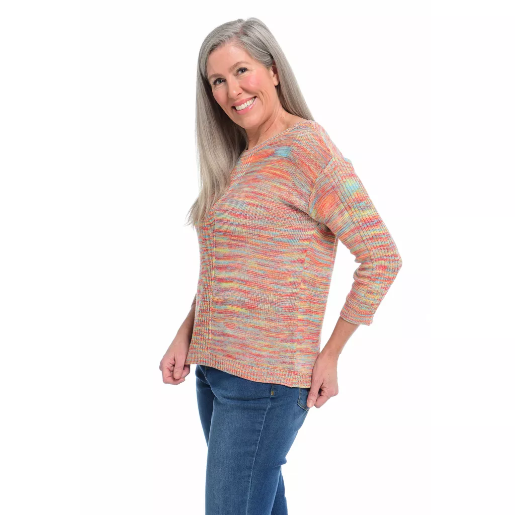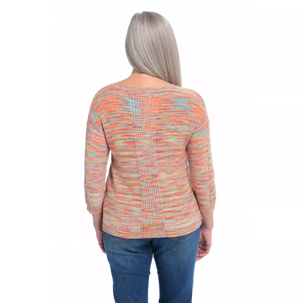 This lightweight sweater is full of stretch and easy-to-wear color! Ribbing on the front adds texture to this eye-catching 3/4 sleeve sweater. The yarn spinning process makes each piece slightly unique.